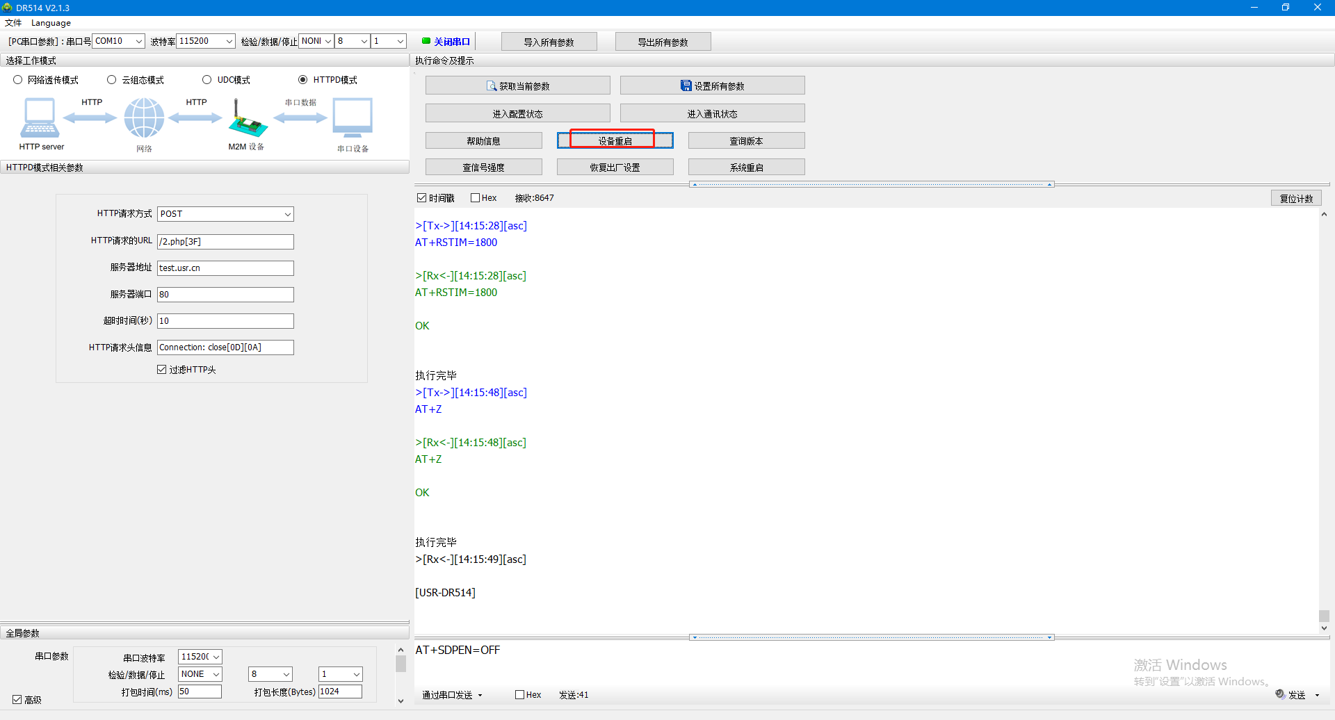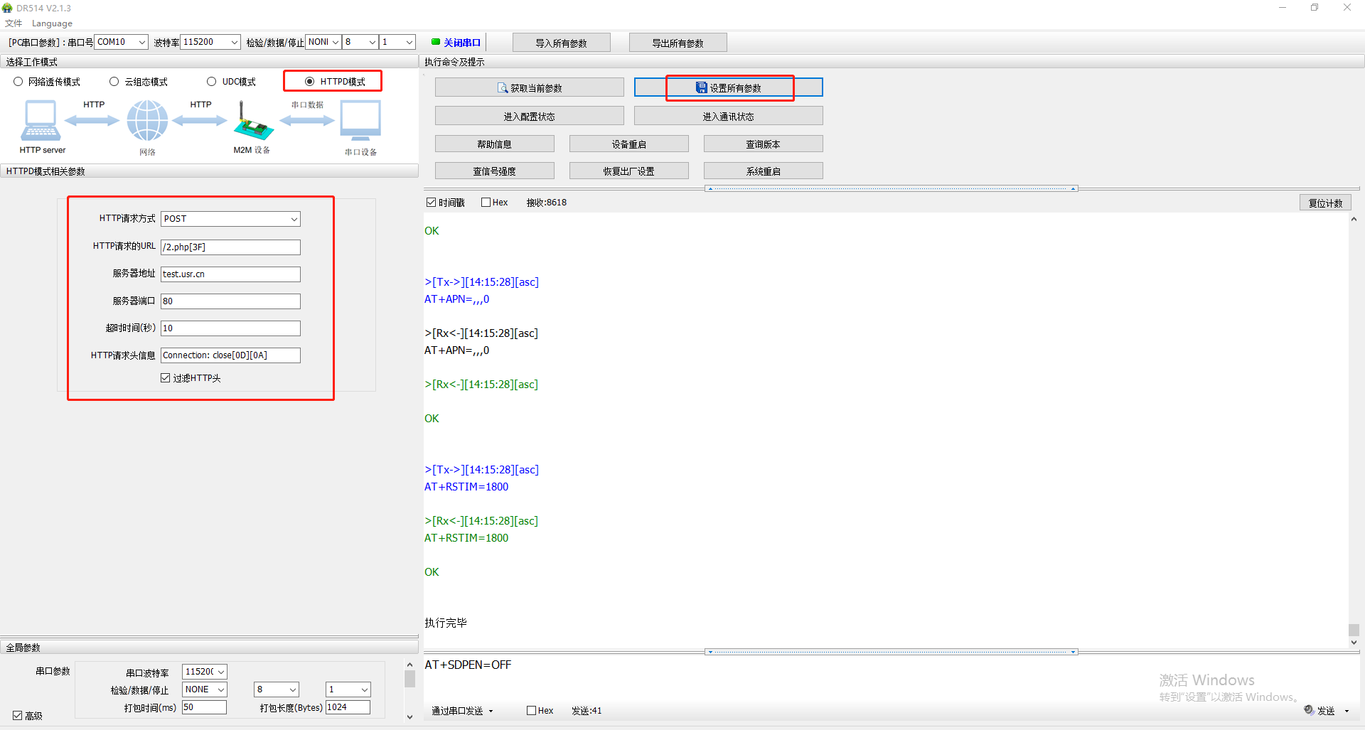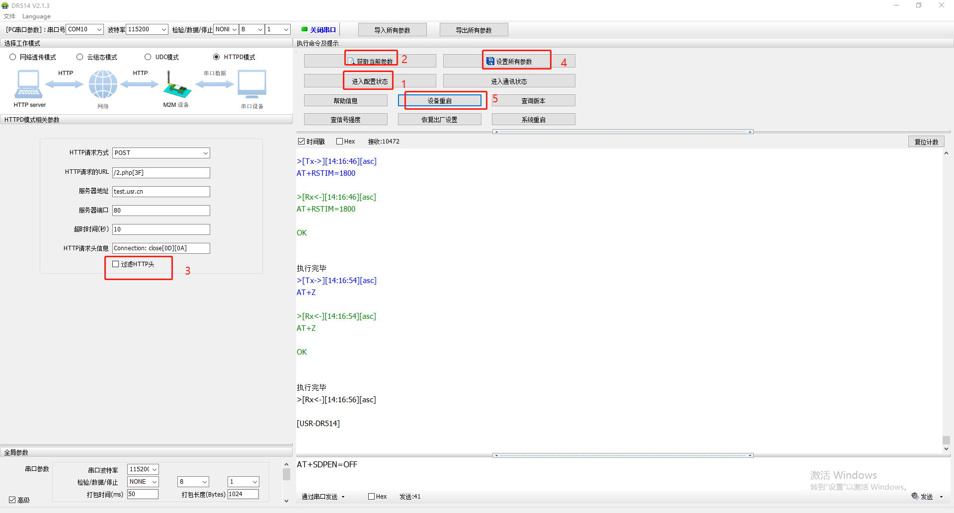(1)關(guān)閉串口助手,打開USR-DR514的設(shè)置軟件,打開串口,點(diǎn)擊進(jìn)入配置狀態(tài),點(diǎn)擊獲取當(dāng)前參數(shù),取消勾選過濾HTTP頭功能,點(diǎn)擊設(shè)置所有參數(shù),點(diǎn)擊設(shè)備重啟。參數(shù)設(shè)置成功之后,設(shè)置軟件關(guān)閉串口。