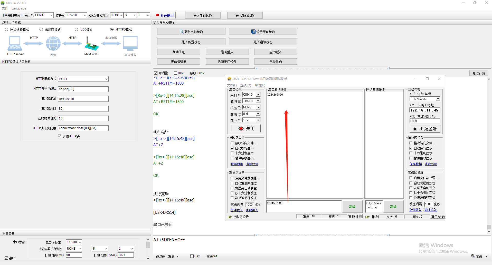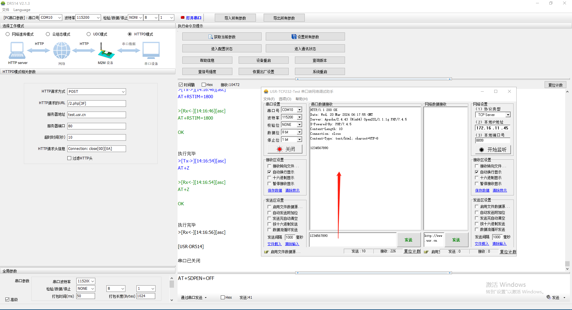 打開串口助手,串口參數(shù)和USR-DR514串口參數(shù)設(shè)置一致,發(fā)送1234567890給有人公司的測試服務(wù)器,測試服務(wù)器收到串口發(fā)送的數(shù)據(jù),會將數(shù)據(jù)返回給串口。因為開啟過濾HTTP頭功能,所以返回的信息中,只有數(shù)據(jù)1234567890。