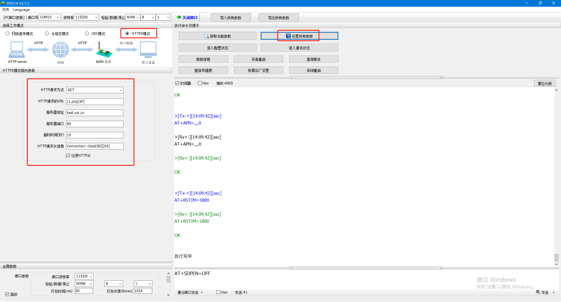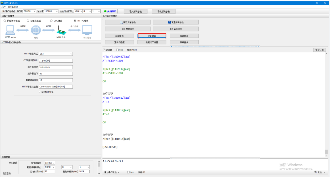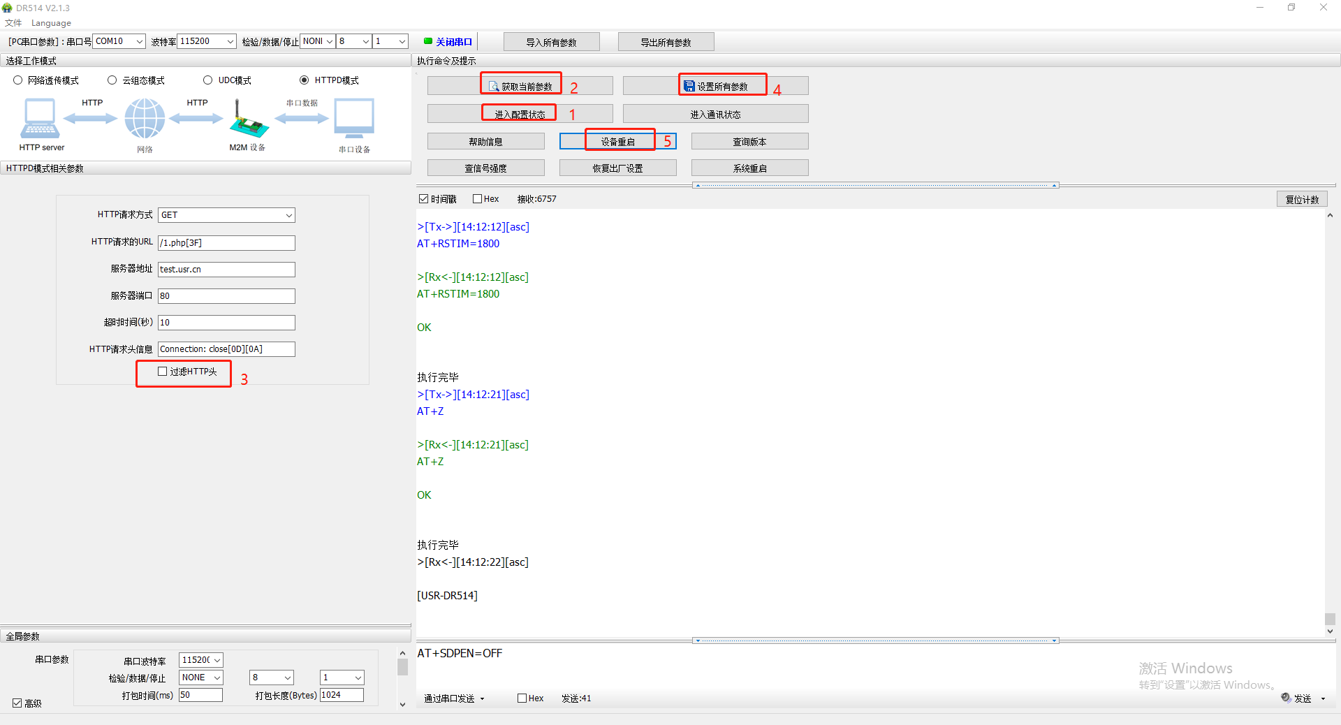 (1)關(guān)閉串口助手,打開USR-DR514的設(shè)置軟件,打開串口,點擊進入配置狀態(tài),點擊獲取當(dāng)前參數(shù),取消勾選過濾HTTP頭功能,點擊設(shè)置所有參數(shù),點擊設(shè)備重啟。參數(shù)設(shè)置成功之后,設(shè)置軟件關(guān)閉串口。