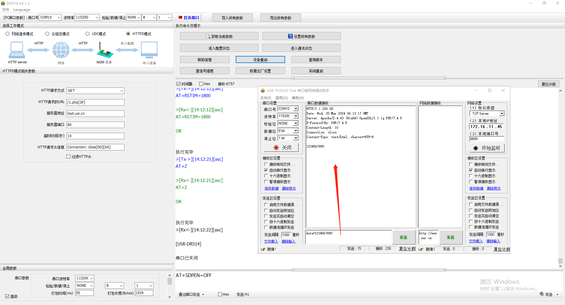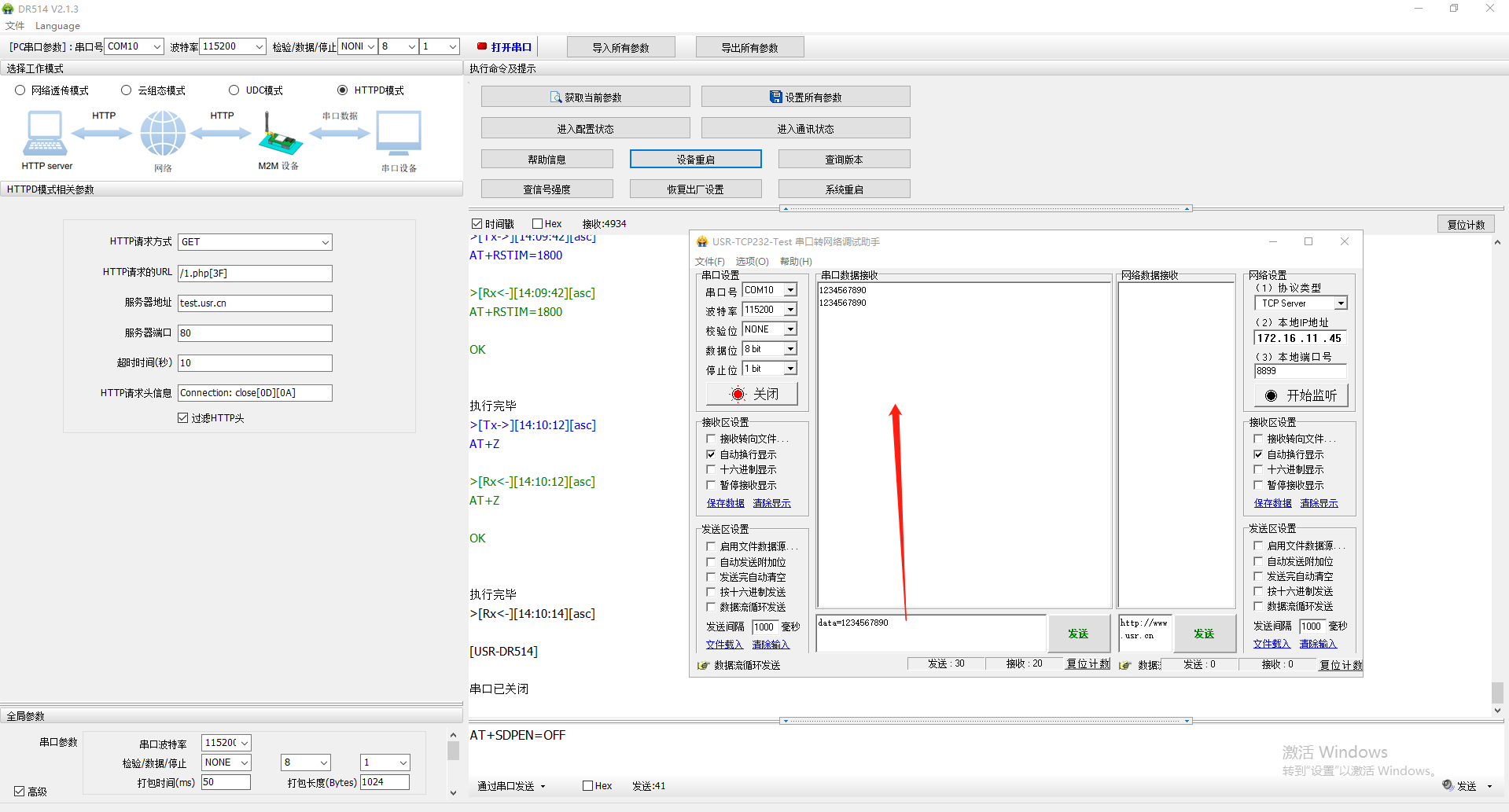 打開串口助手,串口參數(shù)和USR-DR514串口參數(shù)設(shè)置一致,發(fā)送data=1234567890給有人公司的測試服務(wù)器,測試服務(wù)器收到串口發(fā)送的數(shù)據(jù),會將數(shù)據(jù)返回給串口。因為開啟過濾HTTP頭功能,所以返回的信息中,只有數(shù)據(jù)1234567890。