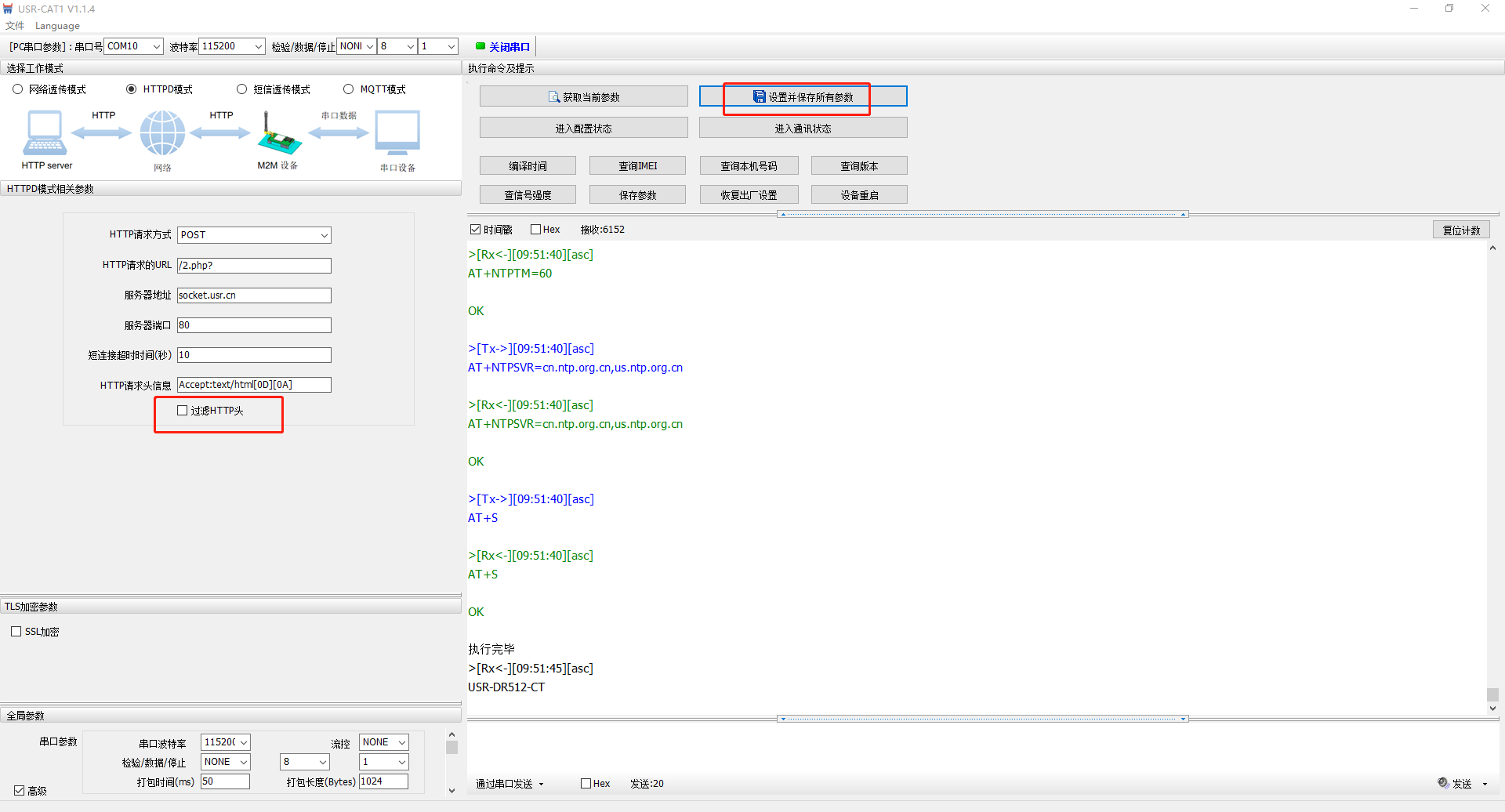 3、USR-DR512使用設(shè)置軟件進入配置狀態(tài),讀取當前參數(shù),取消勾選過濾HTTP頭,設(shè)置并保存所有參數(shù)設(shè)置。