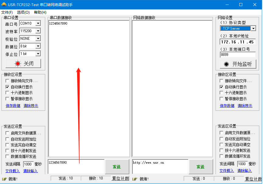 2、USR-DR512串口發(fā)送數(shù)據(jù)1234567890到HTTPD測試服務(wù)器,HTTPD測試服務(wù)器返回數(shù)據(jù)1234567890到串口,串口接收的數(shù)據(jù)過濾報頭,只展示數(shù)據(jù)1234567890。證明USR-DR512的HTTPD POST功能正常。