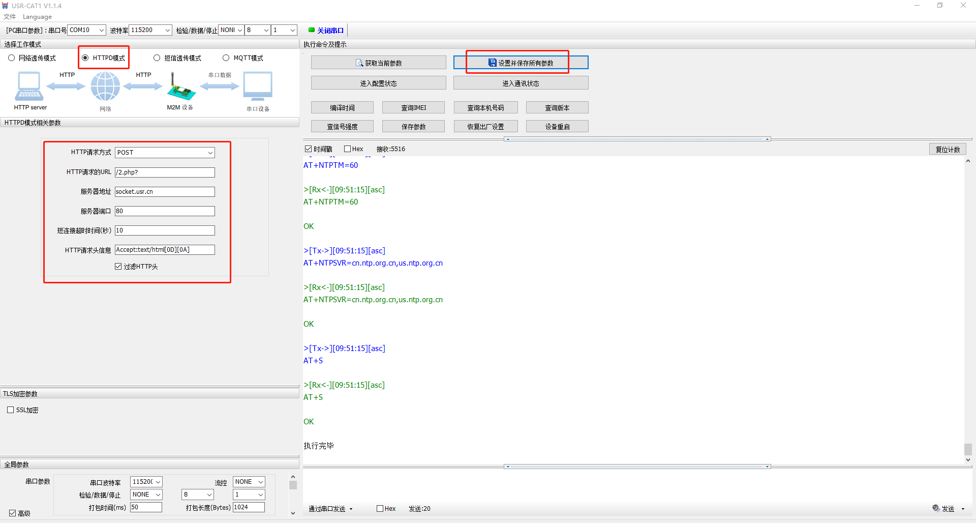 4、勾選HTTPD模式,設(shè)置HTTPD模式相關(guān)參數(shù),點擊設(shè)置并保存所有參數(shù)。USR-DR512參數(shù)保存并重啟。