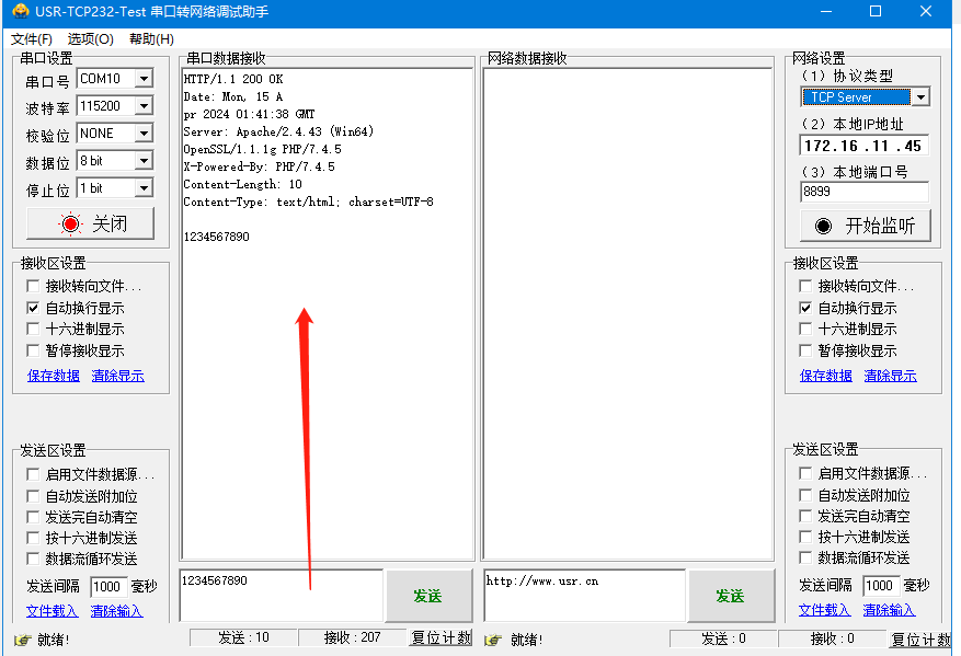 4、USR-DR512串口發(fā)送數(shù)據(jù)1234567890到HTTPD測試服務(wù)器,HTTPD測試服務(wù)器返回數(shù)據(jù)帶報頭到串口。