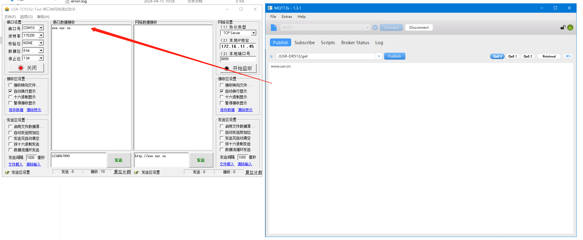 (2)MQTT.fx軟件點擊Publish,輸入/USR-DR512/get,在下面的發(fā)送框輸入數(shù)據(jù)www.xyglz.cn,點擊Publish發(fā)送給USR-DR512串口,串口助手接收數(shù)據(jù)www.xyglz.cn