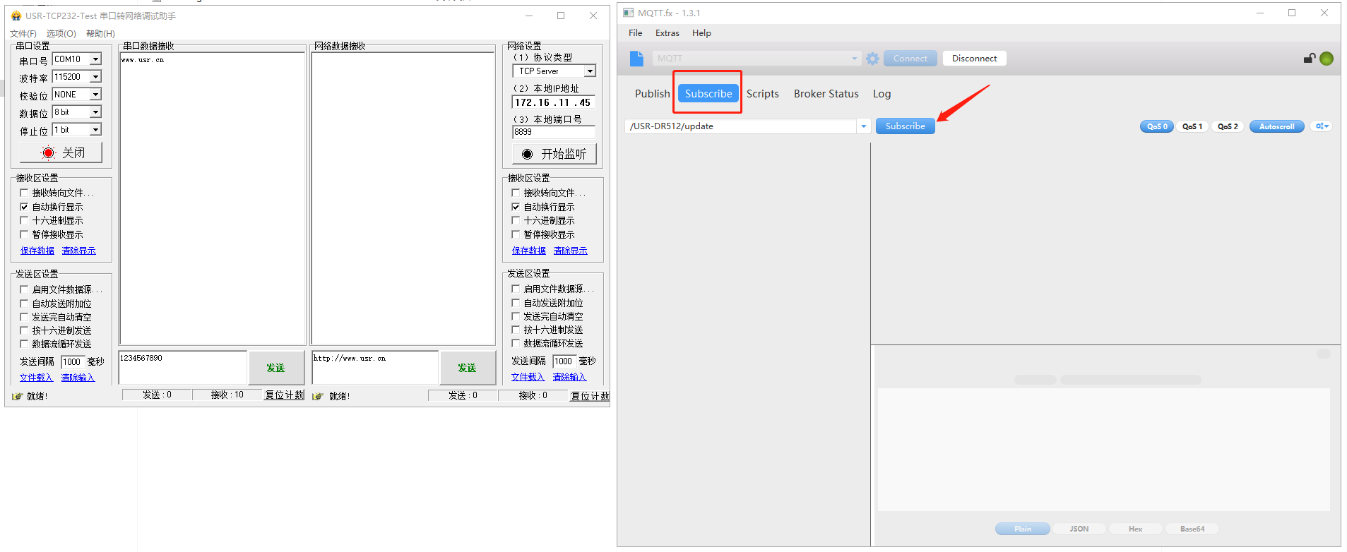 4、MQTT.fx軟件推送,USR-DR512訂閱測試