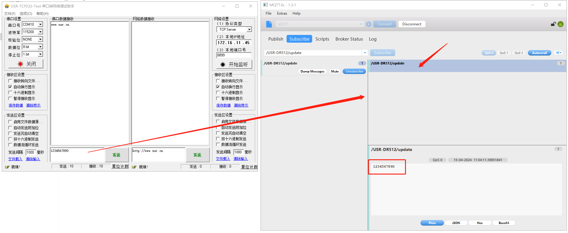 (3)串口助手發(fā)送框輸入數(shù)據(jù)1234567890,發(fā)送給MQTT.fx軟件,點擊MQTT.fx軟件的每一條/USR-DR512/update,可以看到接收的數(shù)據(jù)1234567890