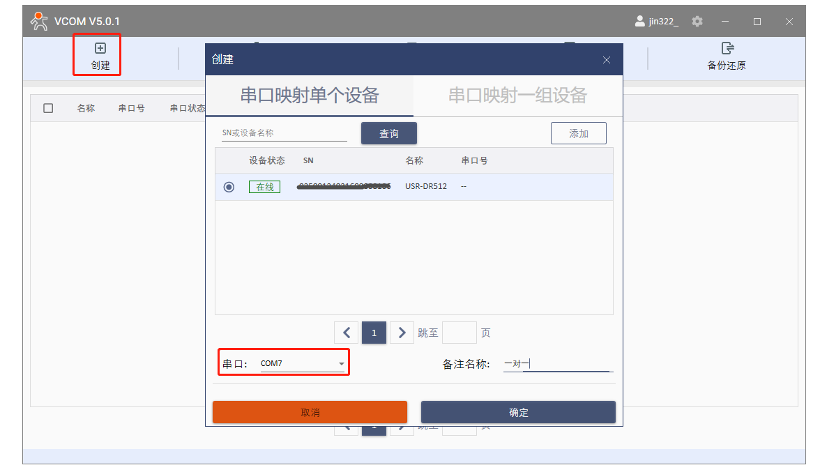 選擇串口映射單個設(shè)備,勾選在線的USR-DR512,用空閑的COM7作為虛擬串口的COM口號,點擊確定。