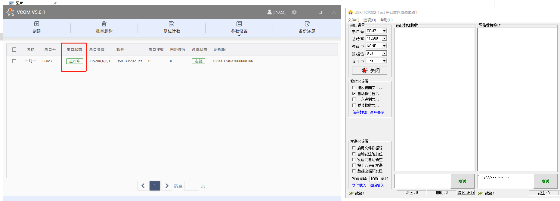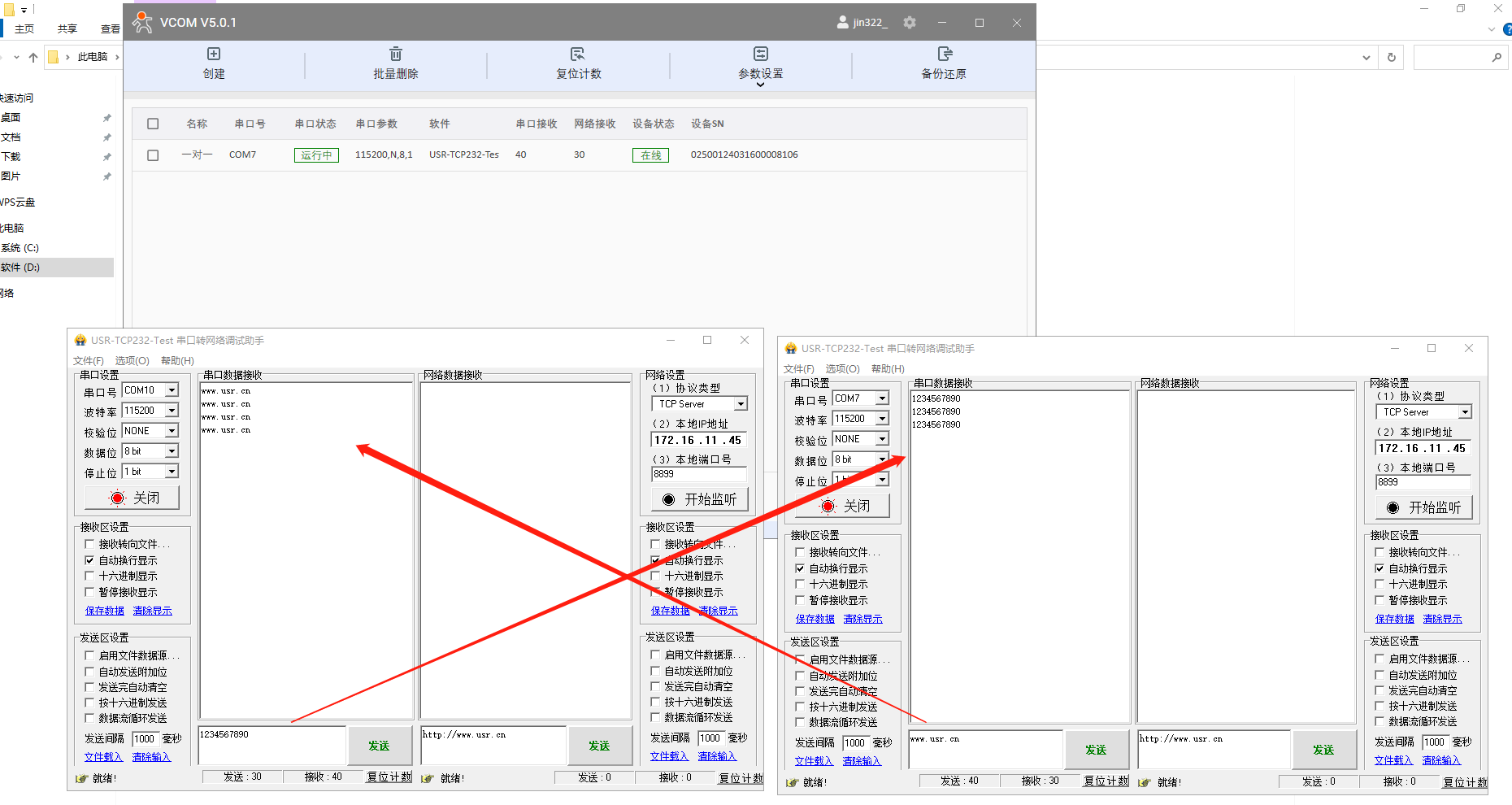 1、打開2個串口助手,分別用USR-DR512實際USB串口COM10打開串口,另一個串口助手用虛擬串口COM7打開串口。