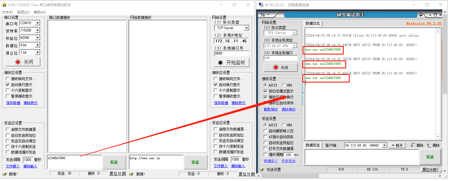 登陸遠(yuǎn)程桌面連接,打開(kāi)一個(gè)網(wǎng)絡(luò)助手,協(xié)議類(lèi)型TCP server,服務(wù)器IP,本地端口100和DR512一樣,點(diǎn)擊連接。