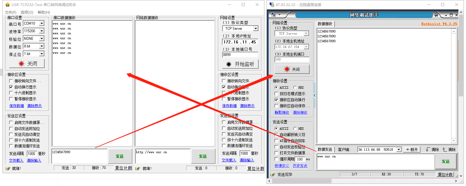 3、USR-DR512串口發(fā)送數(shù)據(jù)1234567890到遠(yuǎn)程服務(wù)器,遠(yuǎn)程服務(wù)器發(fā)送數(shù)據(jù)www.xyglz.cn到串口,可以實現(xiàn)串口和網(wǎng)絡(luò)之間的數(shù)據(jù)雙向通訊。