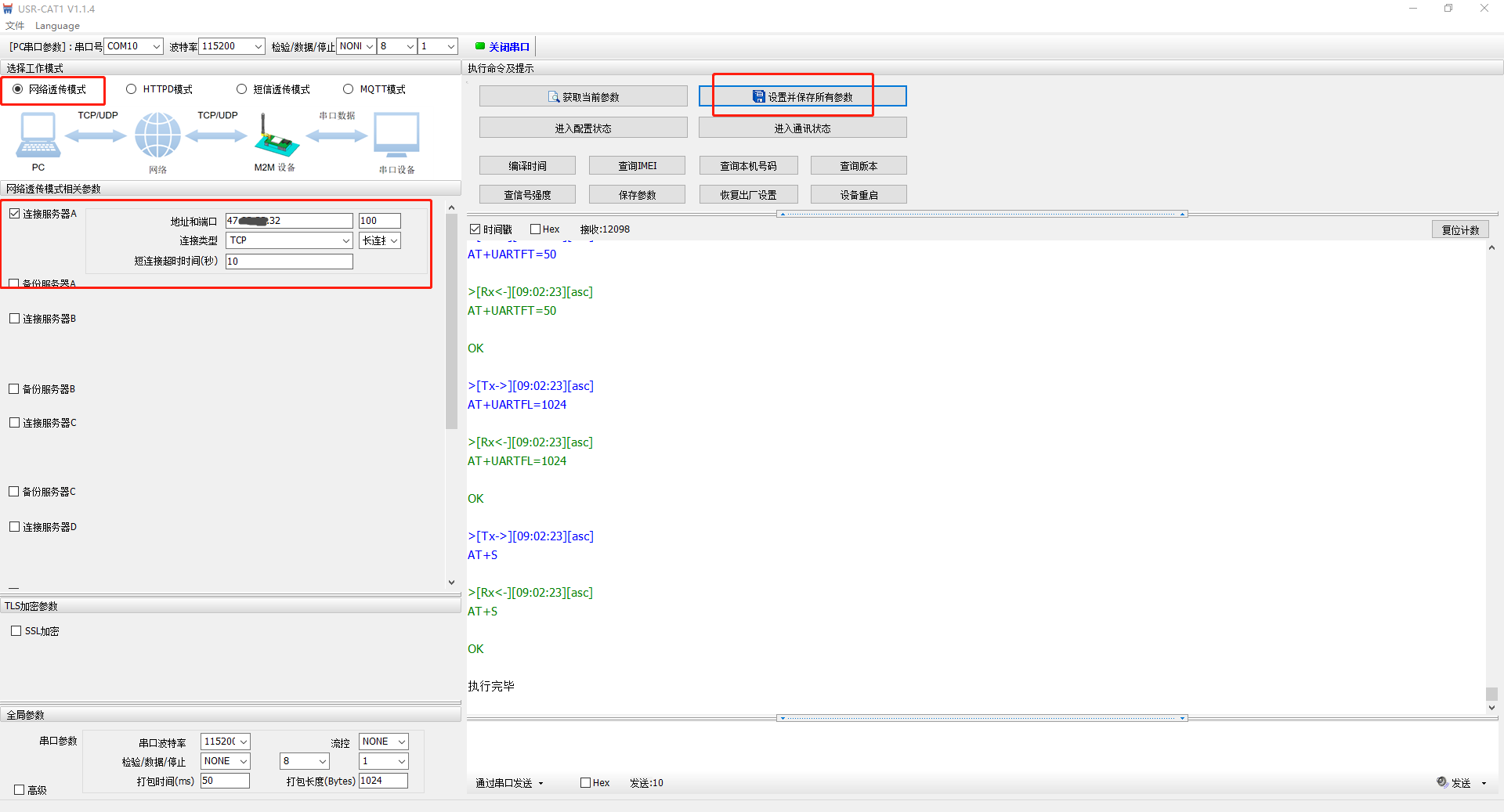 4、勾選連接服務(wù)器A,地址設(shè)置遠(yuǎn)程服務(wù)器IP,端口100,連接類型TCP,長連接。其他參數(shù)保持默認(rèn),點擊設(shè)置并保存所有參數(shù)。USR-DR512參數(shù)保存并重啟。