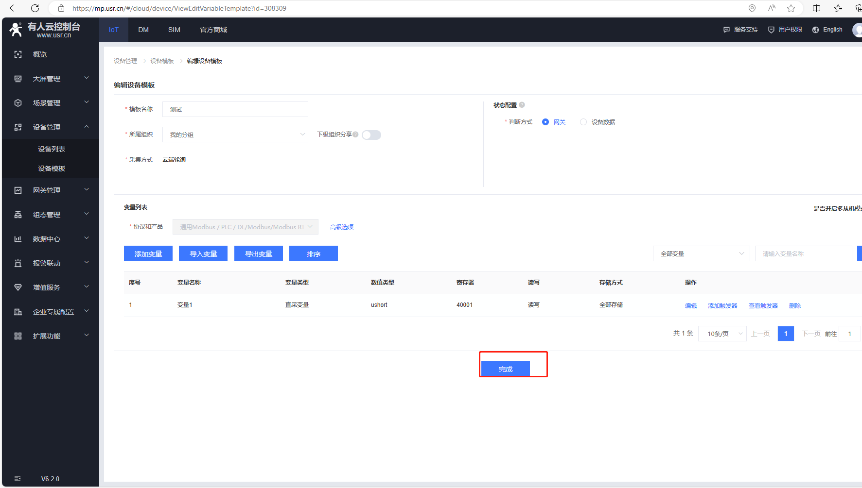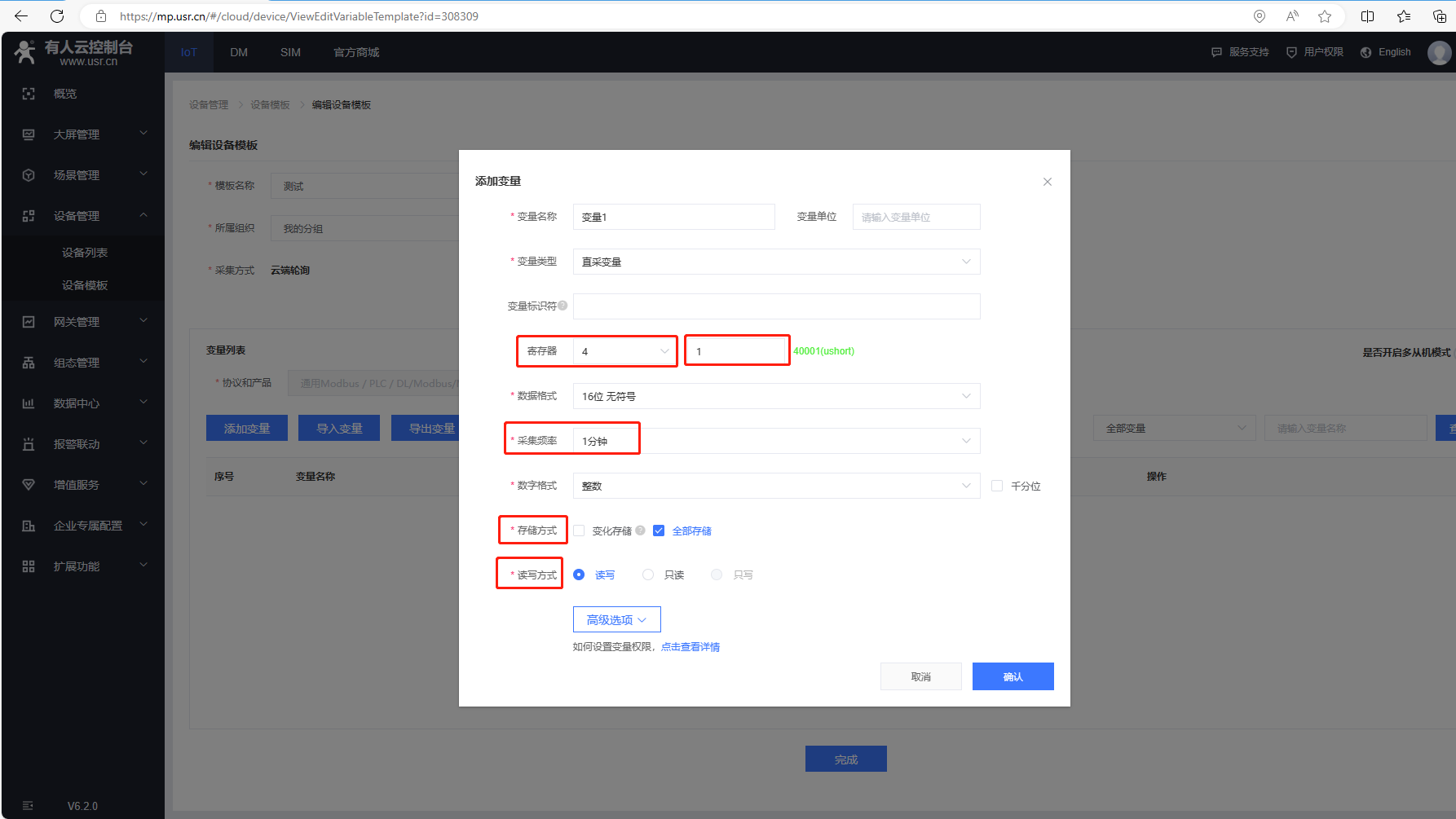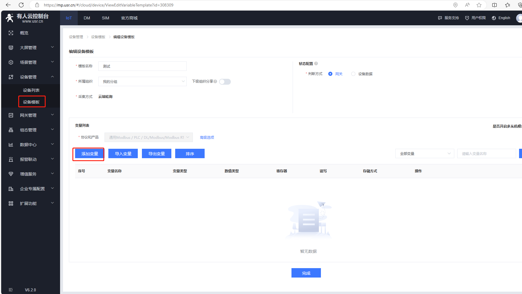 選擇新建模板,輸入設(shè)備模板名稱,通用Modbus/PLC/DL,選擇Modbus,協(xié)議選擇Modbus Rtu,采集方式云端,最后確認。