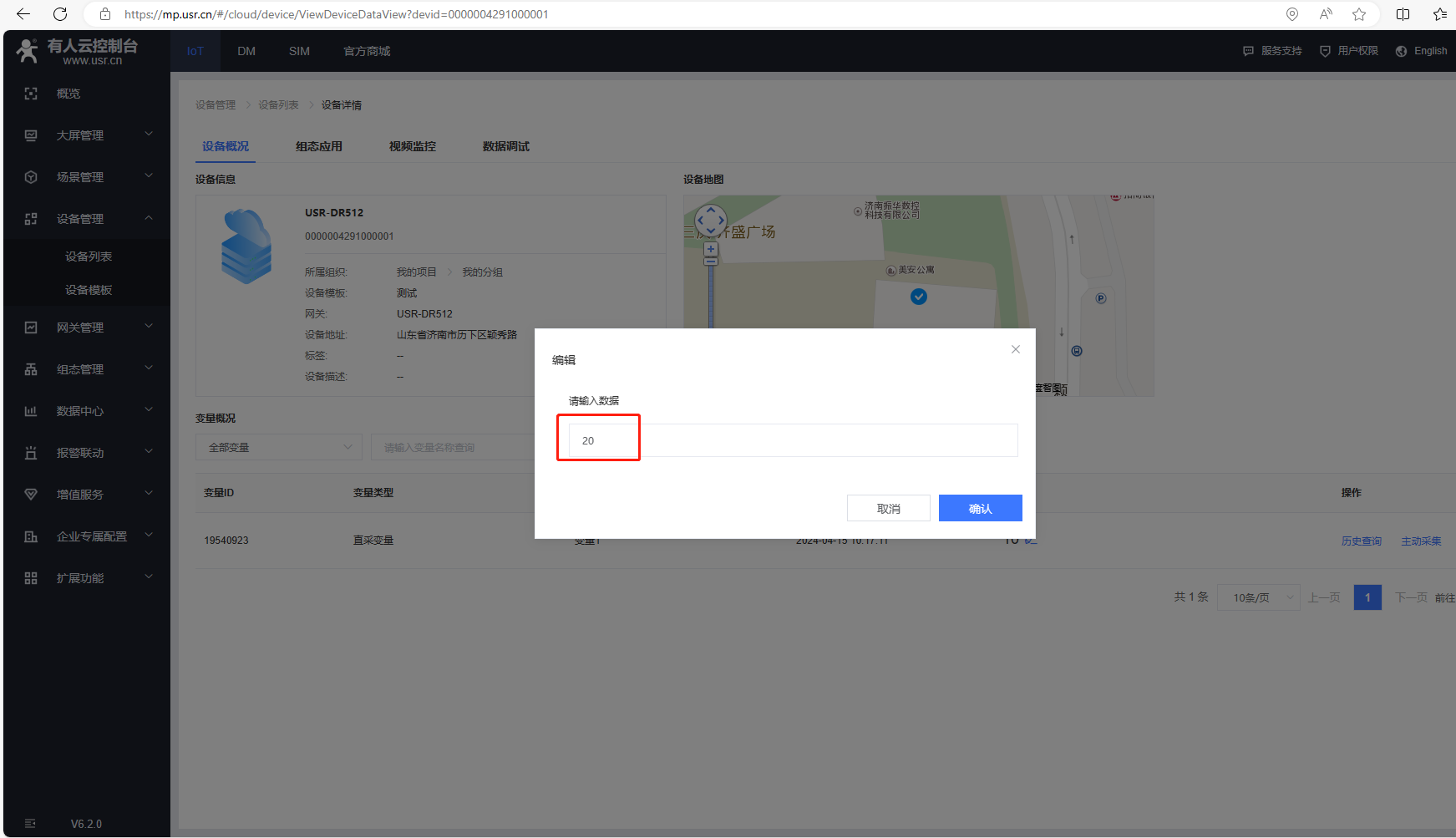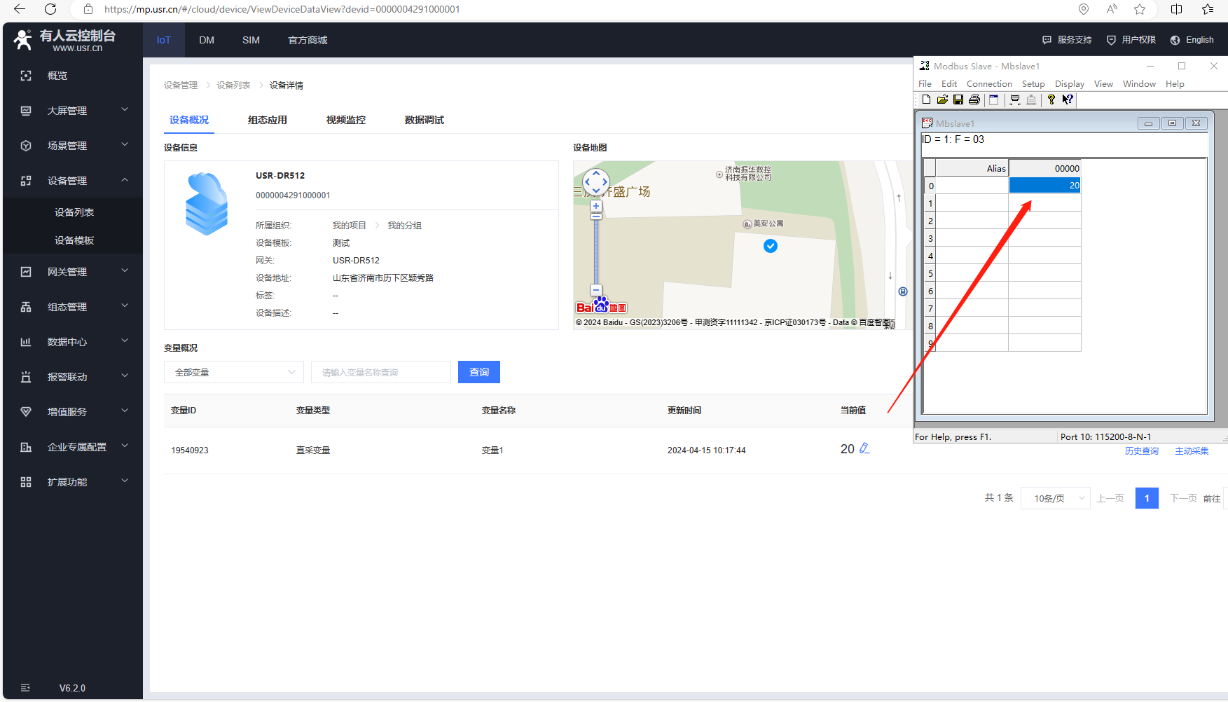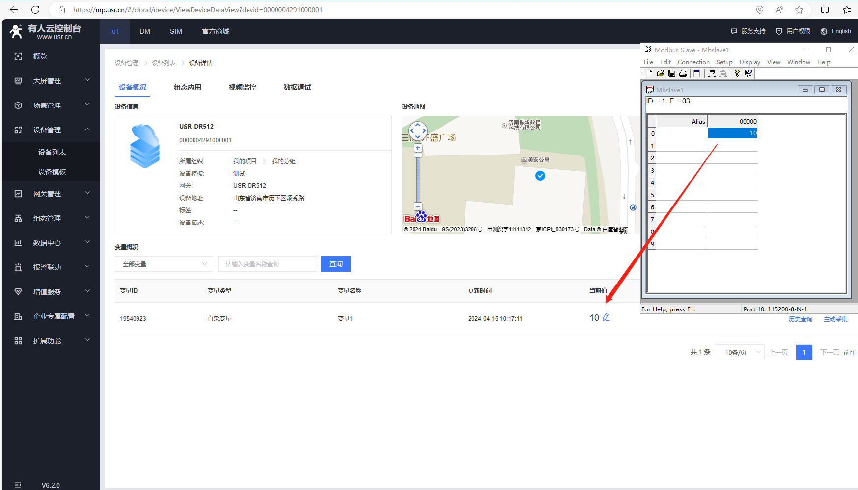 2、MODBUS slave數(shù)據(jù)設(shè)置10,有人云設(shè)備列表1分鐘采集,可以看到變量采集的當(dāng)前值數(shù)據(jù)10。