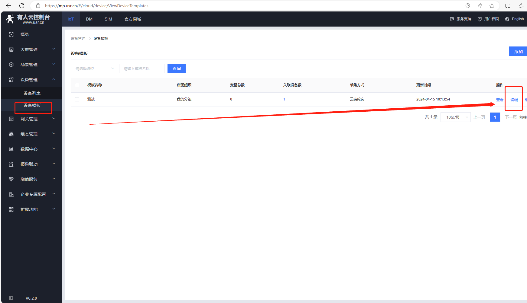 (7)添加變量,點擊設(shè)備管理,點擊設(shè)備模板,點擊編輯。