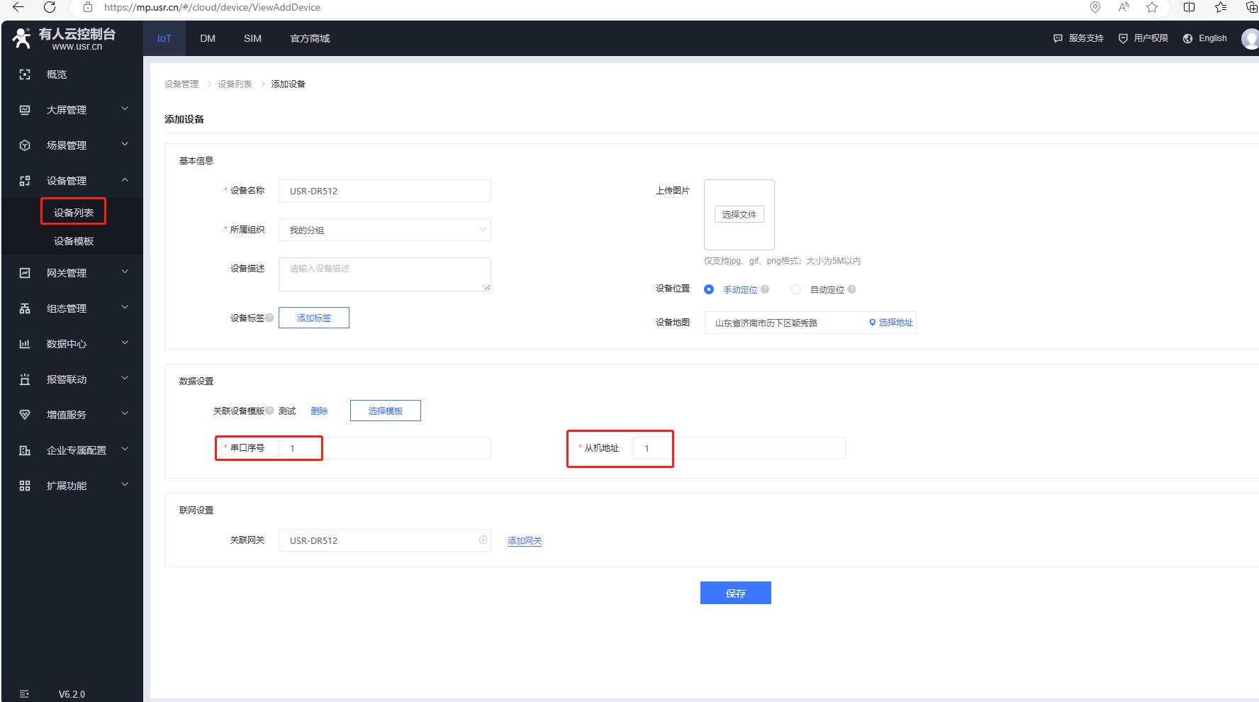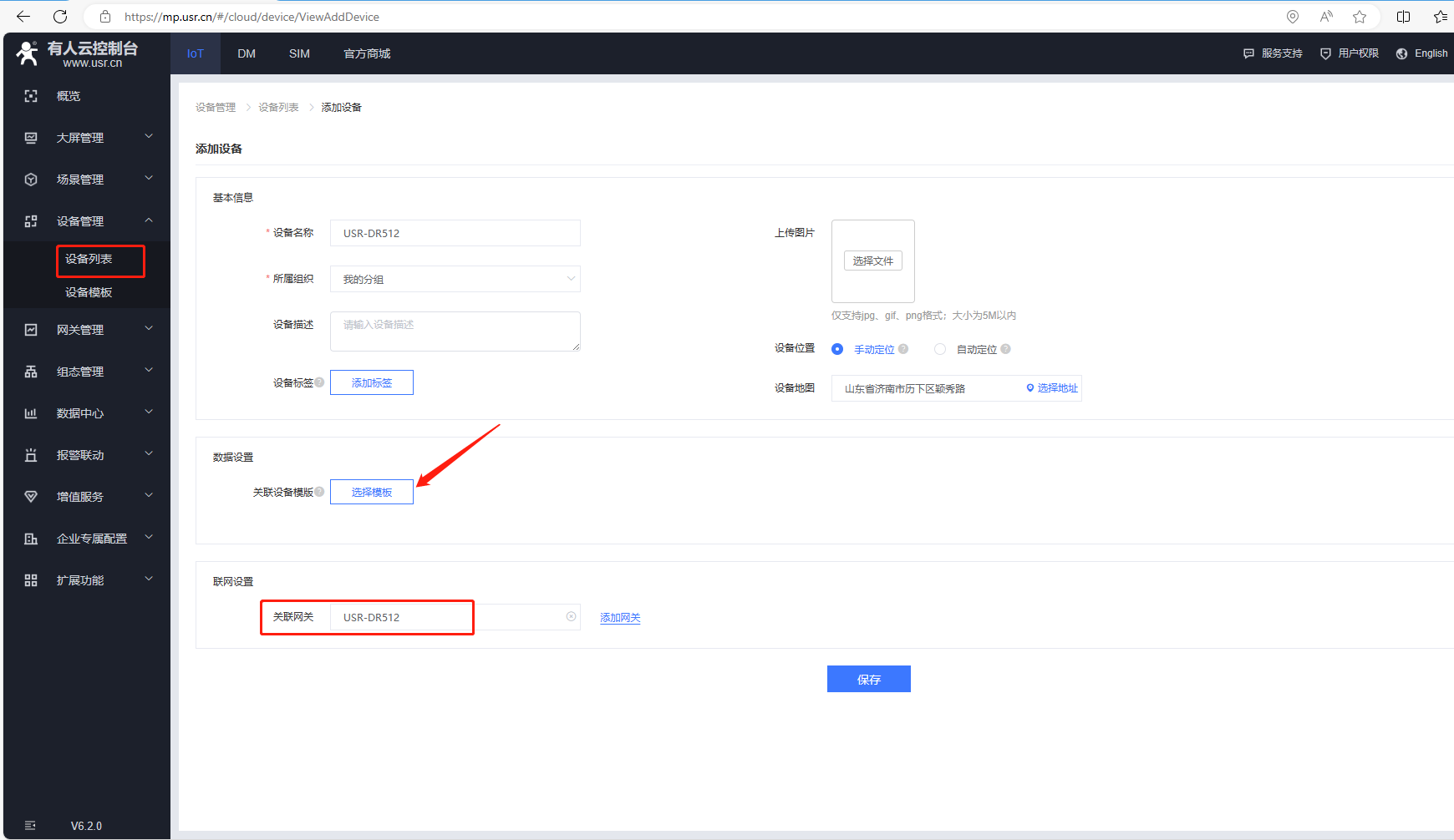 聯(lián)網(wǎng)設(shè)置,關(guān)聯(lián)網(wǎng)關(guān)選擇自身設(shè)備,USR-DR512,最后點擊保存。