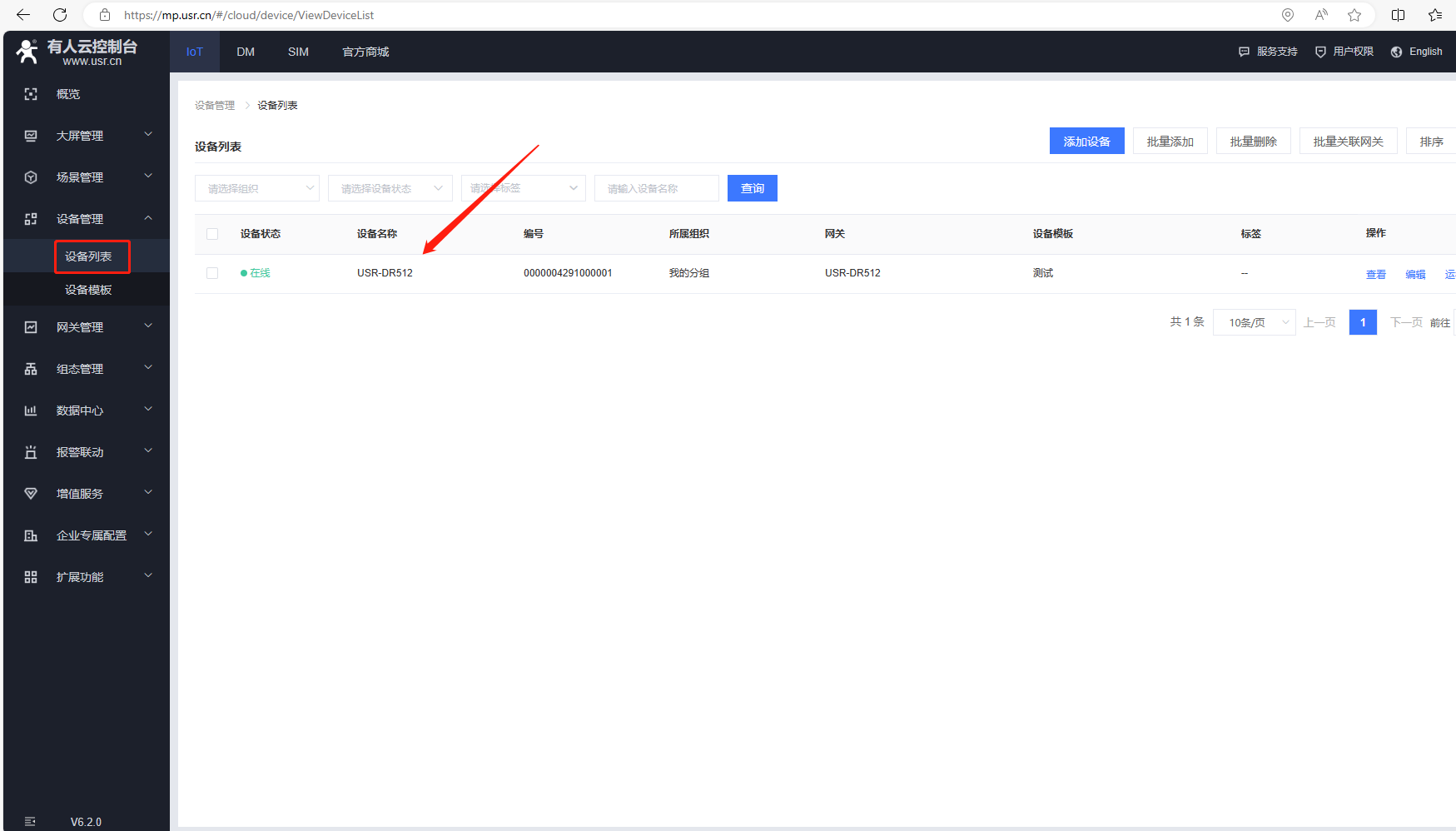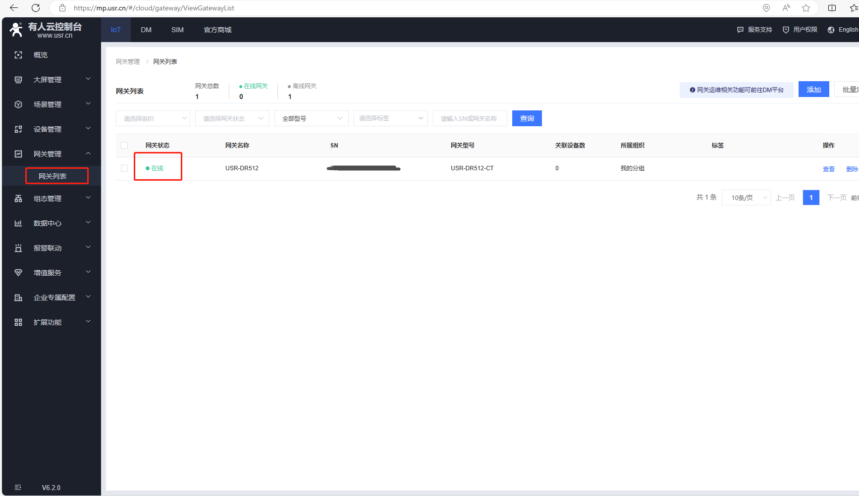 (3)添加完成,返回網(wǎng)關(guān)列表,USR-DR512支持我們內(nèi)置SIM卡,聯(lián)網(wǎng)正常后,網(wǎng)絡(luò)狀態(tài)在線。