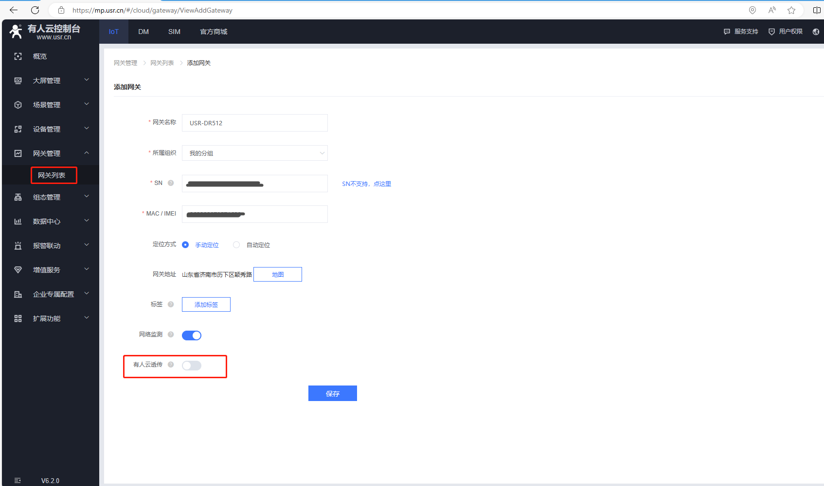 (2)USR-DR512查看產(chǎn)品反面標簽,上面有SN信息,可以微信掃碼,查看SN和IMEI信息,在有人云上添加設(shè)備,用云端輪詢時有人云透傳需要關(guān)閉,最后點擊保存。