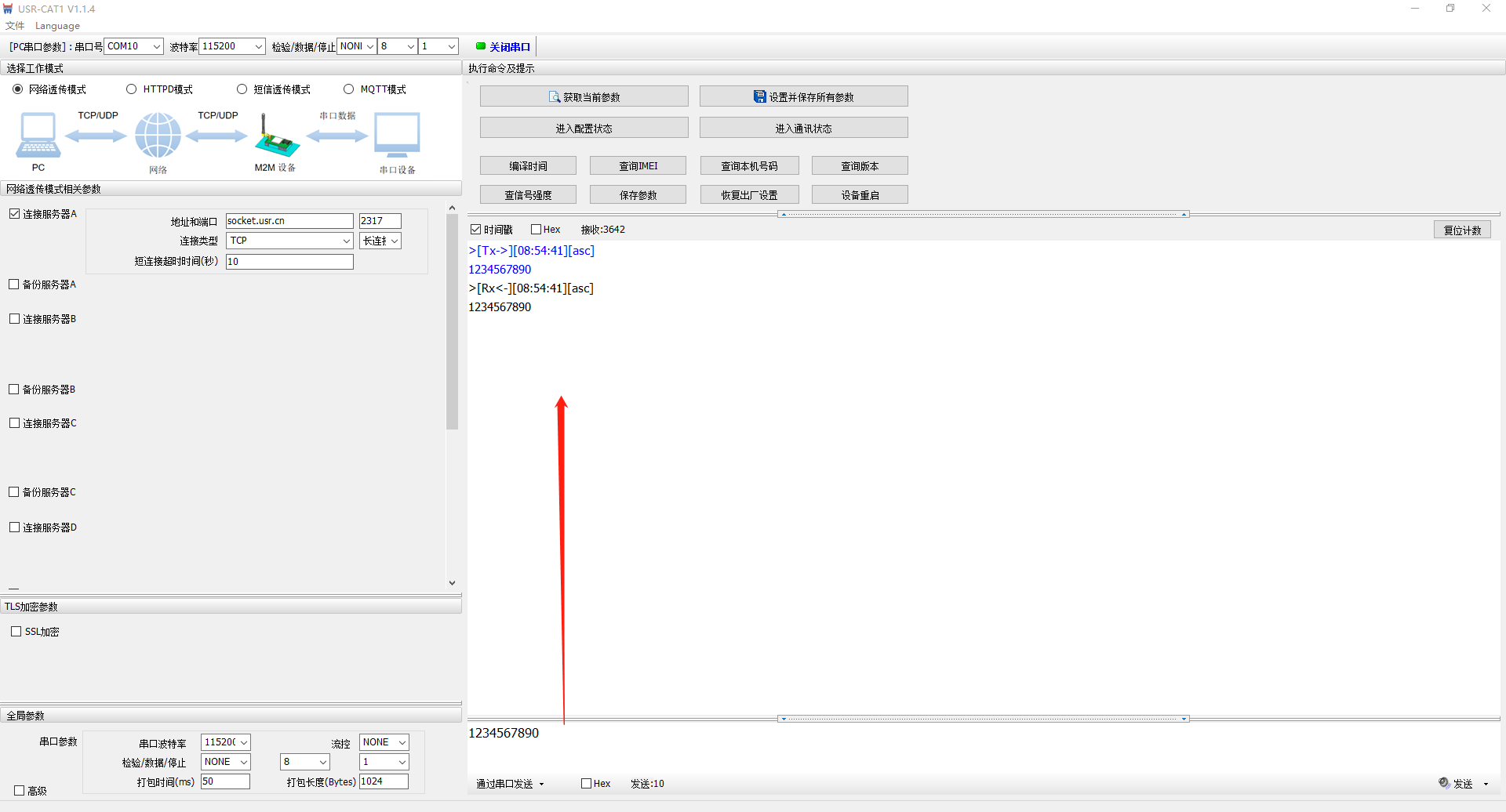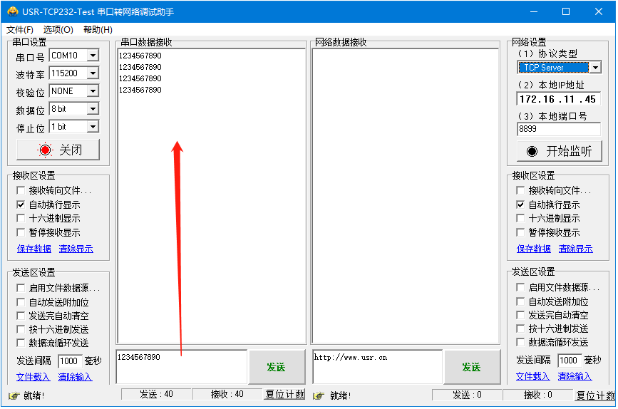 打開串口助手COM10,串口參數和USR-DR512串口參數設置一致,發(fā)送1234567890給有人公司的測試服務器,測試服務器收到串口發(fā)送的數據,會將數據返回給串口。