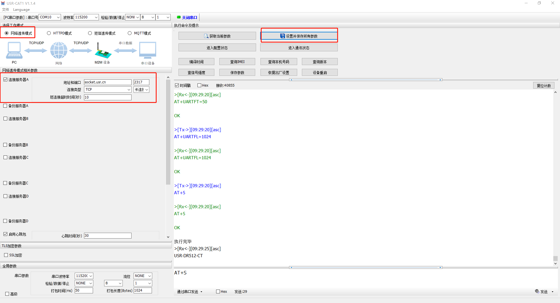 4、勾選連接服務器A,地址設置socket.usr.cn,端口2317,連接類型TCP,長連接。其他參數保持默認,點擊設置并保存所有參數。USR-DR512參數保存并重啟。