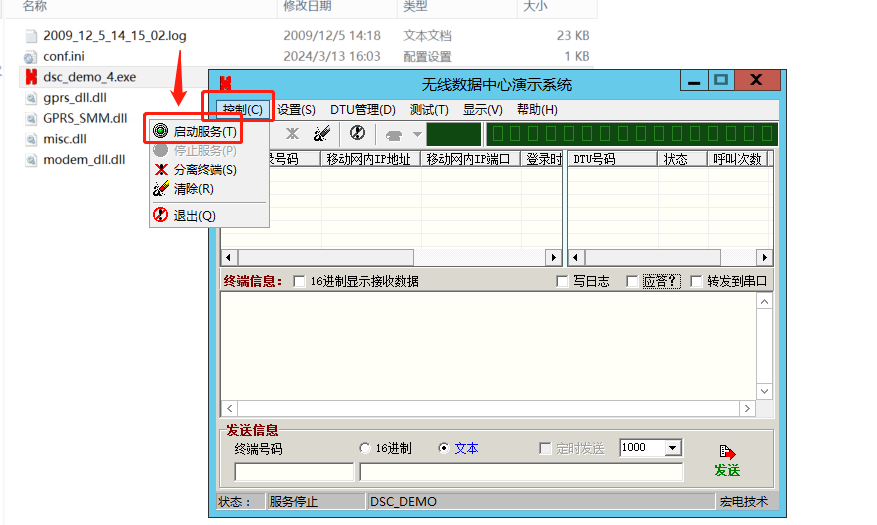 6、無(wú)線(xiàn)數(shù)據(jù)中心演示系統(tǒng)發(fā)送信息區(qū),對(duì)終端號(hào)碼0001,發(fā)送1234567890,USR-DR504連接的串口助手,接收到數(shù)據(jù)1234567890。