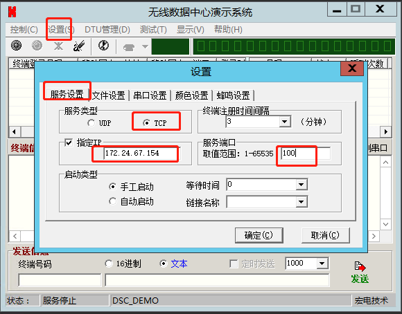 2、點(diǎn)擊設(shè)置,點(diǎn)擊服務(wù)設(shè)置,服務(wù)類(lèi)型勾選TCP,勾選指定IP,輸入遠(yuǎn)程服務(wù)器對(duì)應(yīng)的服務(wù)器IP,服務(wù)端口用100,點(diǎn)擊確定。