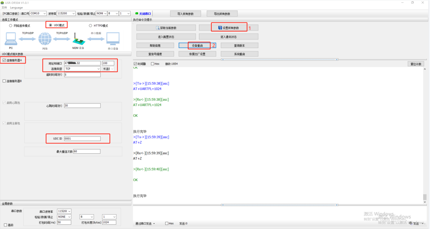 4、選擇UDC模式,勾選連接服務(wù)器A,地址設(shè)置要連接的遠(yuǎn)程服務(wù)器地址,端口100,連接類(lèi)型TCP,長(zhǎng)連接。UDC ID用0001。設(shè)置完參數(shù),點(diǎn)擊設(shè)置所有參數(shù),點(diǎn)擊設(shè)備重啟。