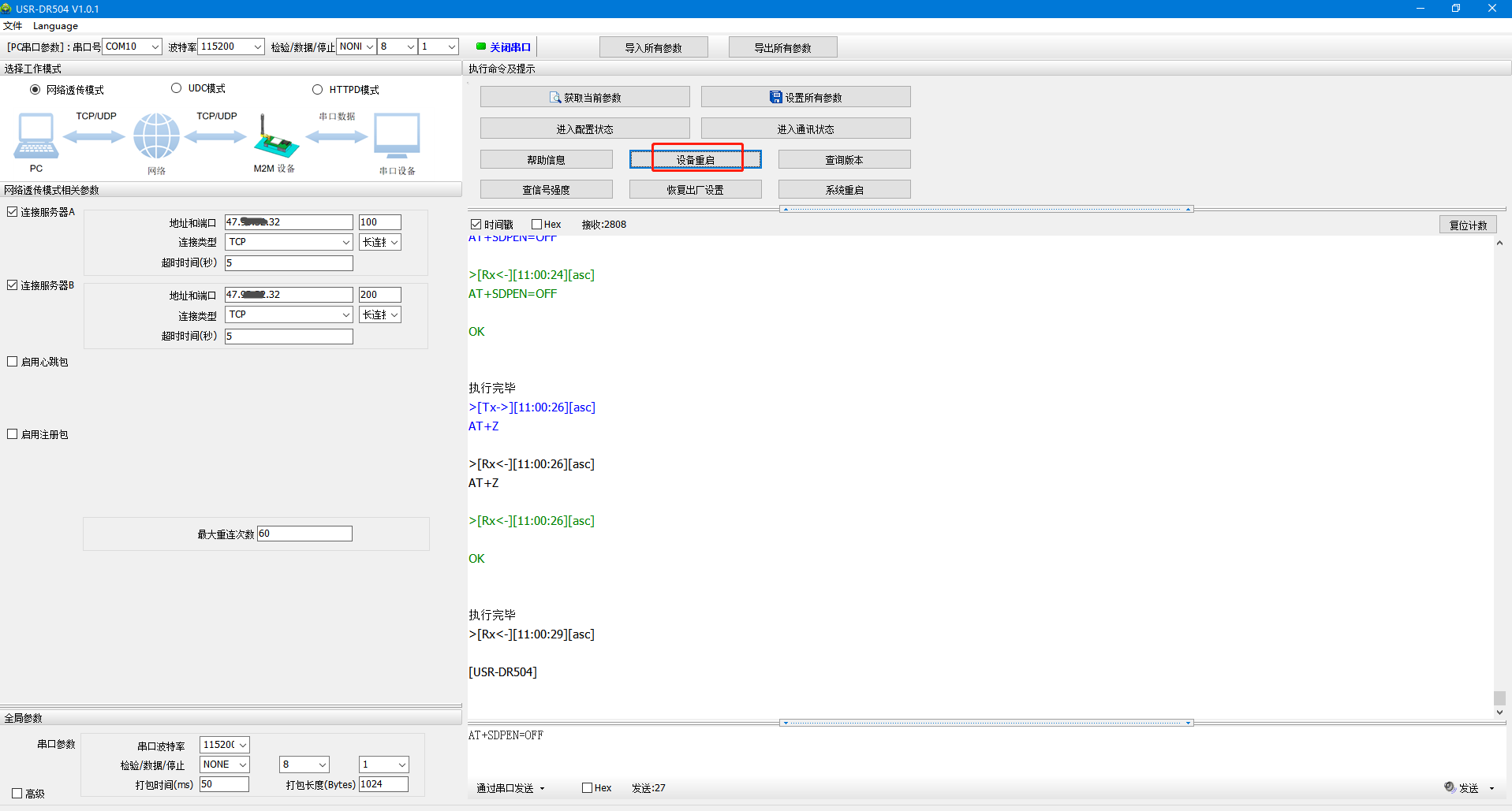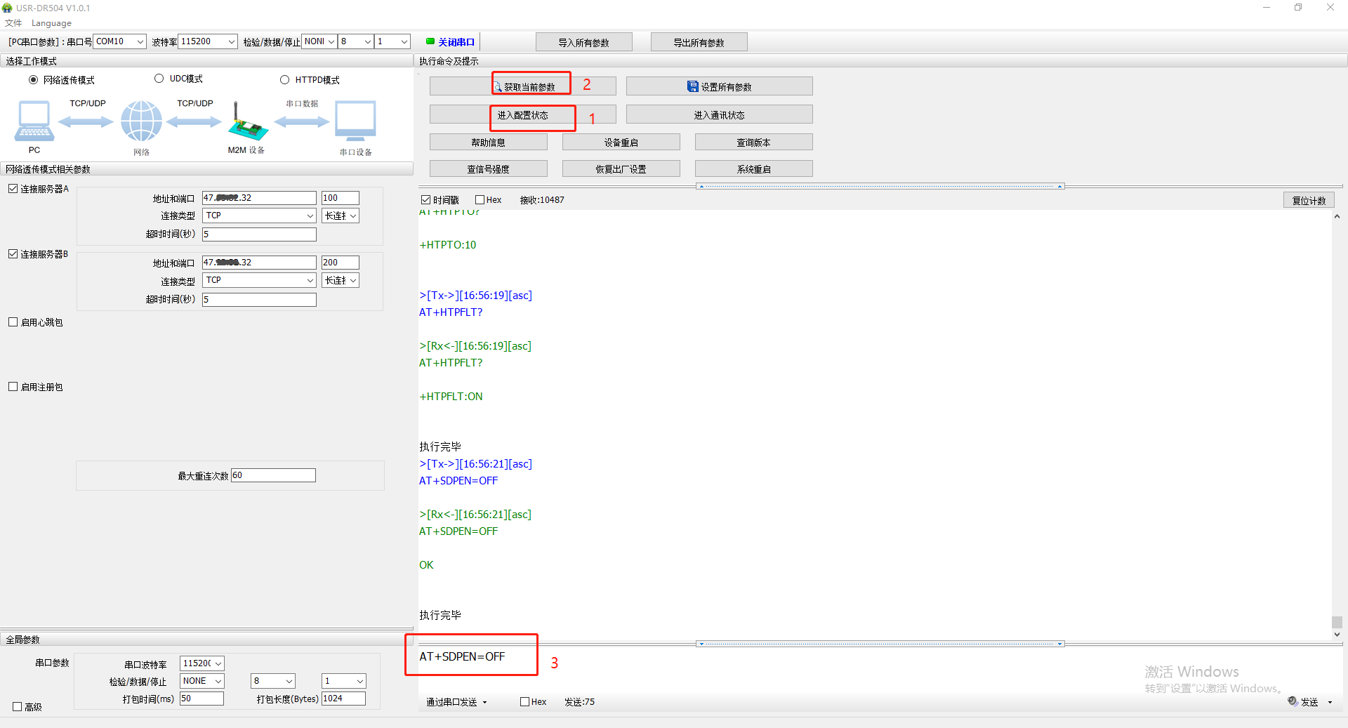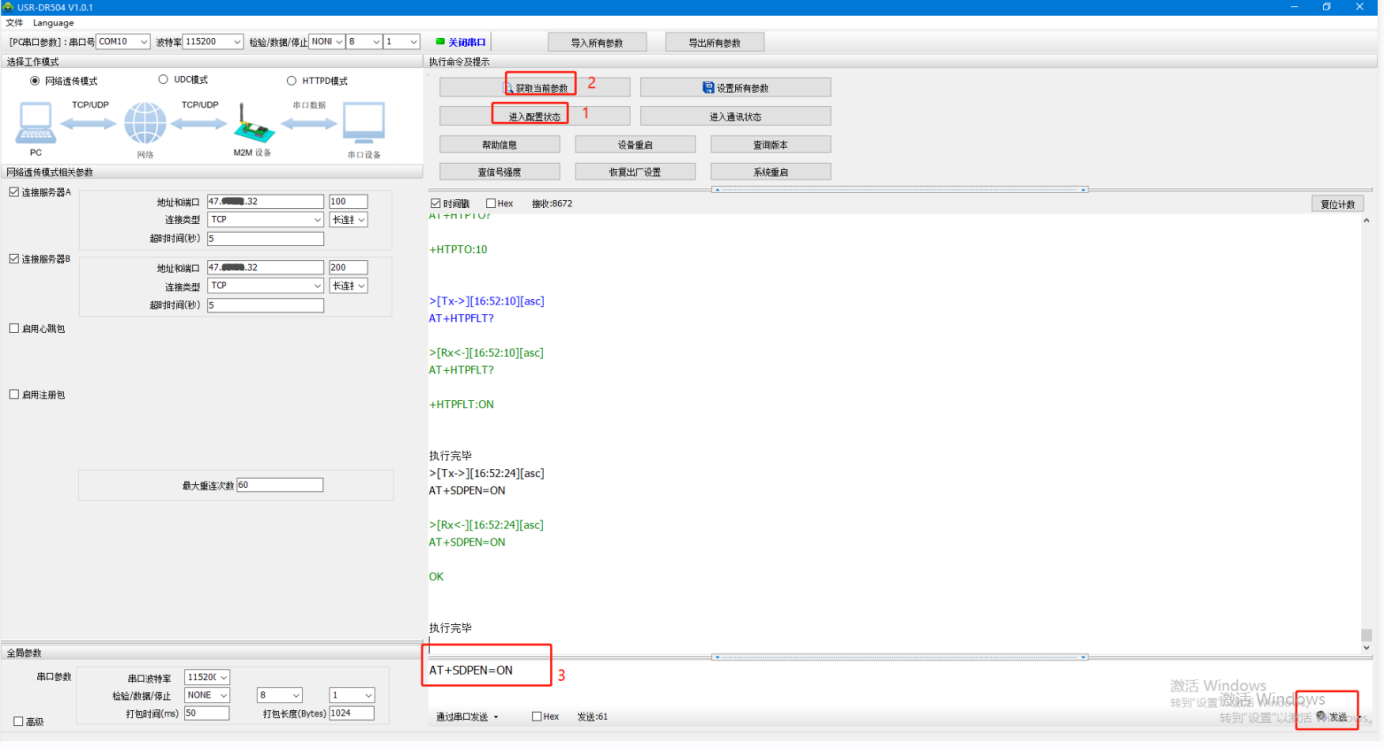 5、串口再次進(jìn)入配置狀態(tài),獲取當(dāng)前參數(shù),發(fā)送AT指令A(yù)T+SDPEN=ON開啟套接字分發(fā)功能,點擊設(shè)備重啟,保存參數(shù)設(shè)置。
