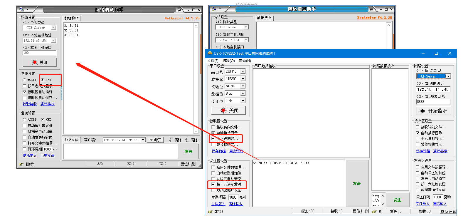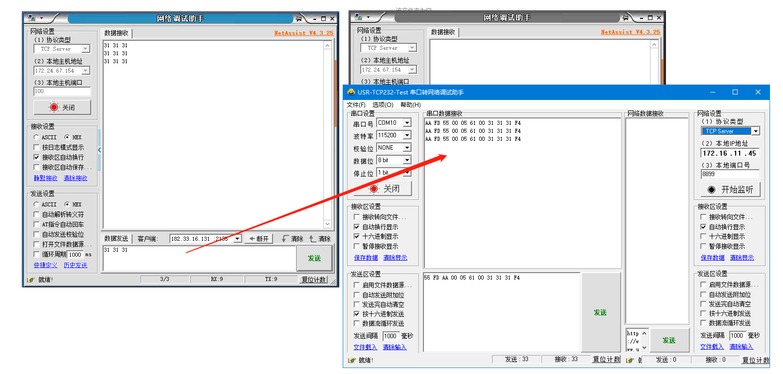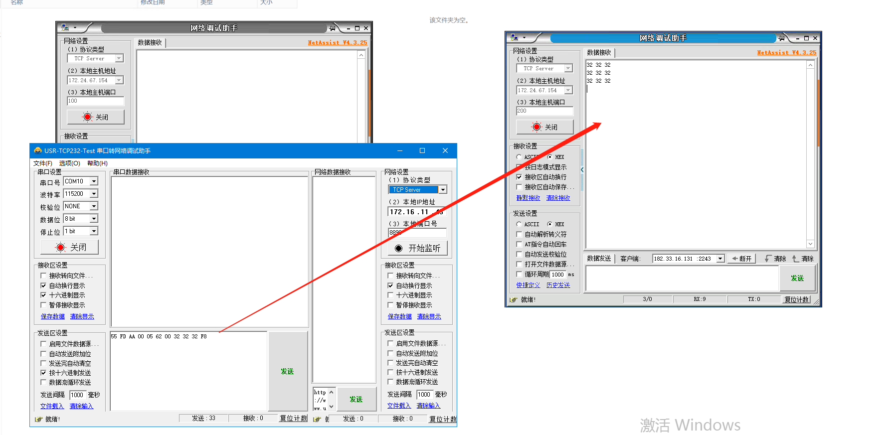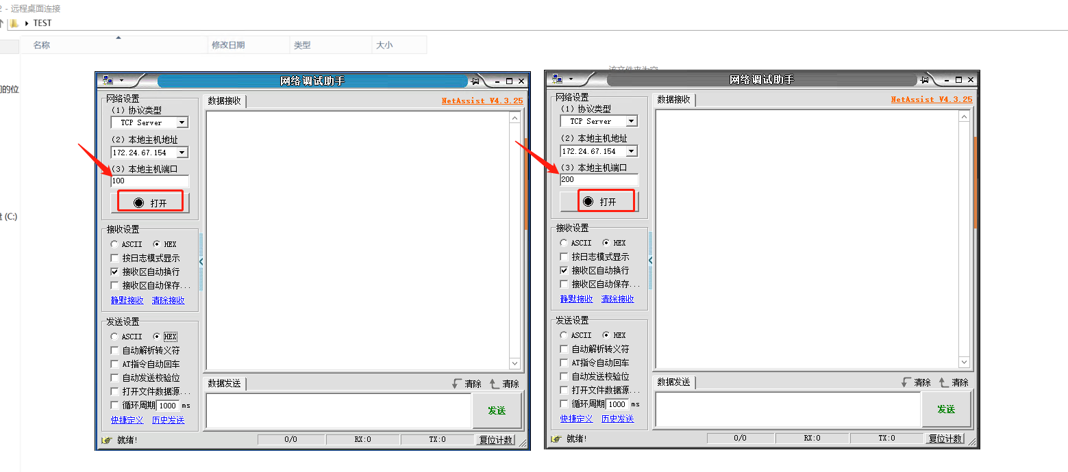 1、登錄遠(yuǎn)程服務(wù)器,打開2個網(wǎng)絡(luò)助手,分別使用2個端口100、200,點擊連接。USR-DR504會和2個網(wǎng)絡(luò)助手建立TCP連接。