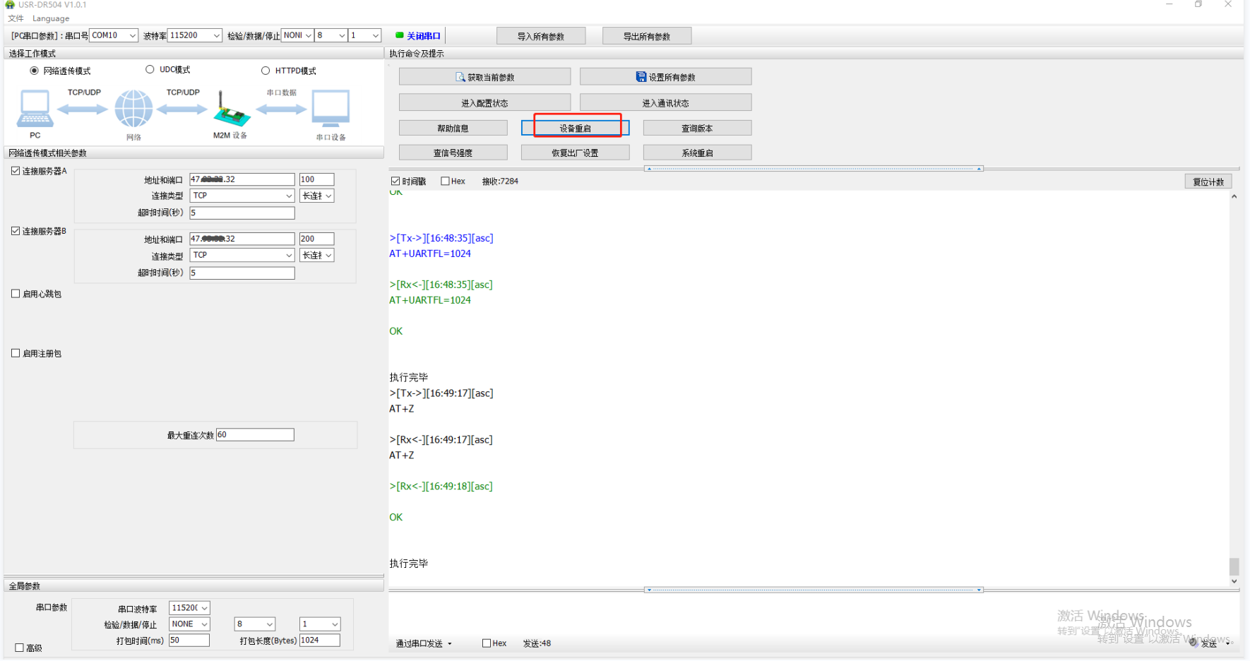 設(shè)置完參數(shù),點擊設(shè)置所有參數(shù),再點擊設(shè)備重啟。