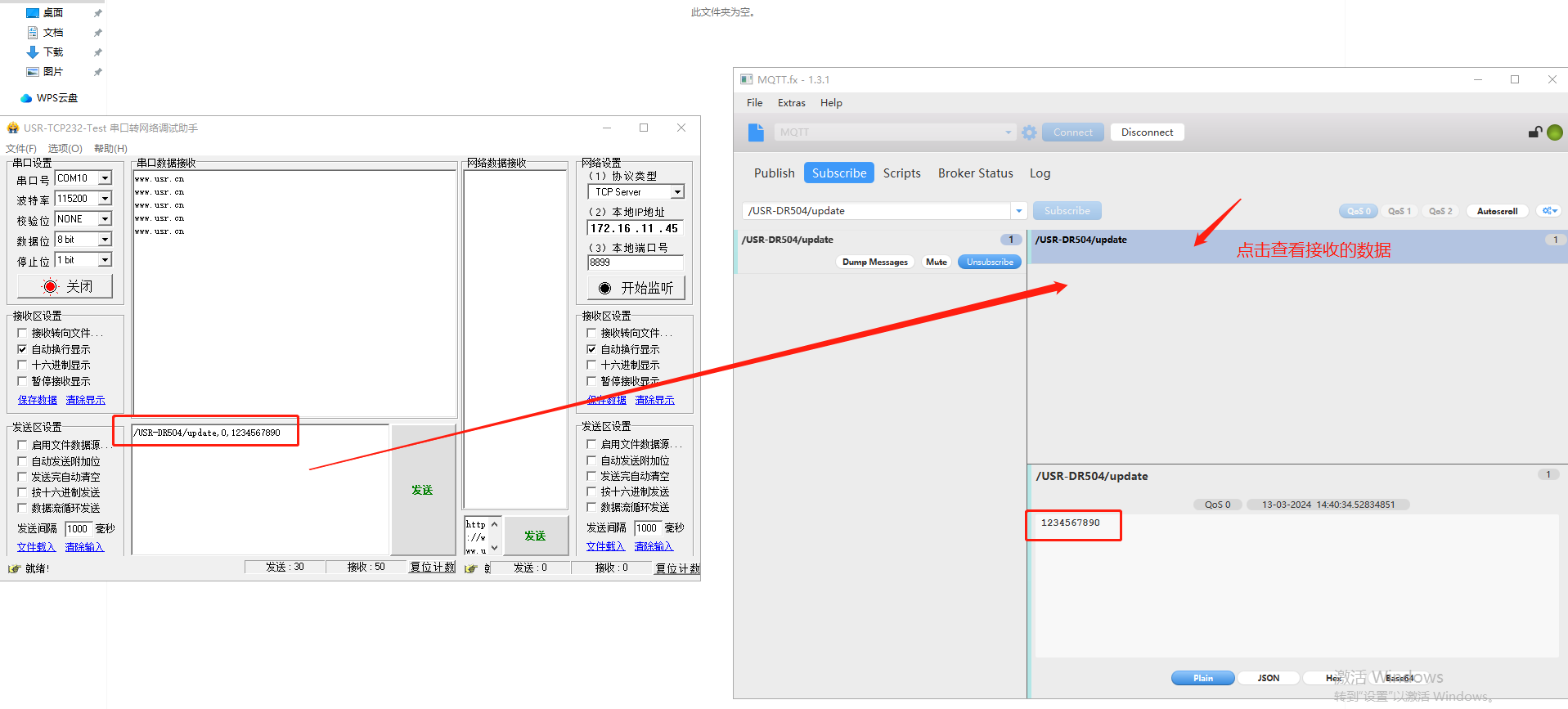 串口助手發(fā)送框輸入/USR-DR504/update,0,1234567890,發(fā)送給MQTT.fx軟件,點擊MQTT.fx軟件的每一條/USR-DR504/update可以看到接收的數(shù)據(jù)1234567890