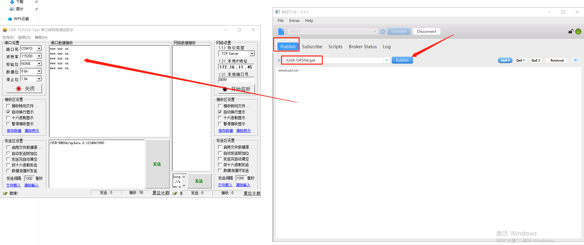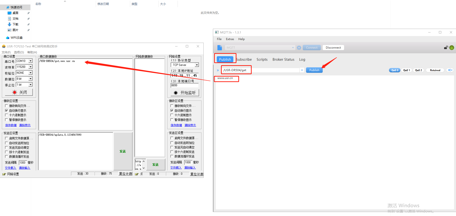 (3)MQTT.fx軟件點擊Publish,輸入/USR-DR504/get,在下面的發(fā)送框輸入數(shù)據(jù)www.xyglz.cn,點擊Publish發(fā)送給USR-DR504串口,串口助手接收數(shù)據(jù)/USR-DR504/get,www.xyglz.cn,按照格式輸出數(shù)據(jù)。
