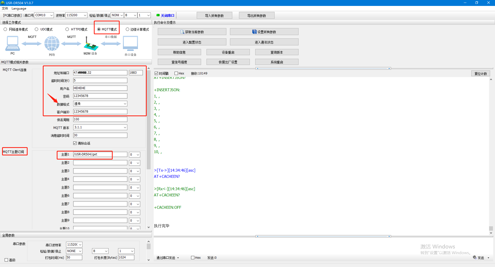 (7)MQTT主題訂閱:主題1填寫/USR-DR504/get