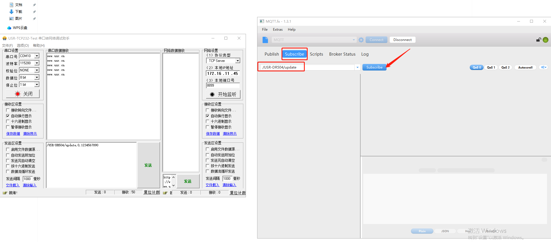 3、MQTT.fx軟件推送,USR-DR504訂閱測試(數(shù)據(jù)格式是透傳)