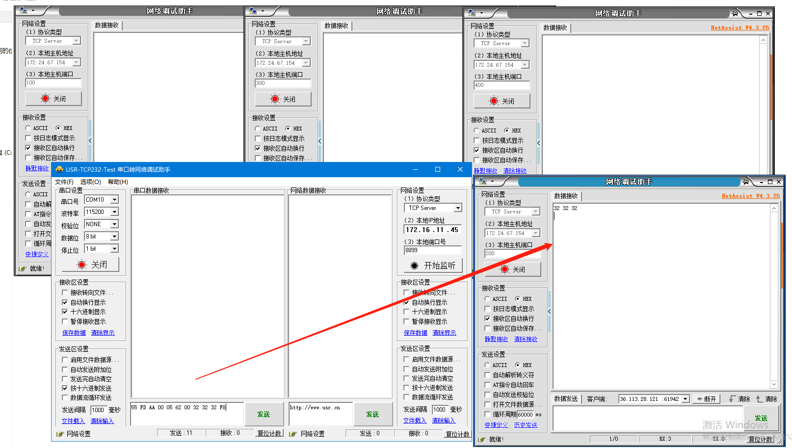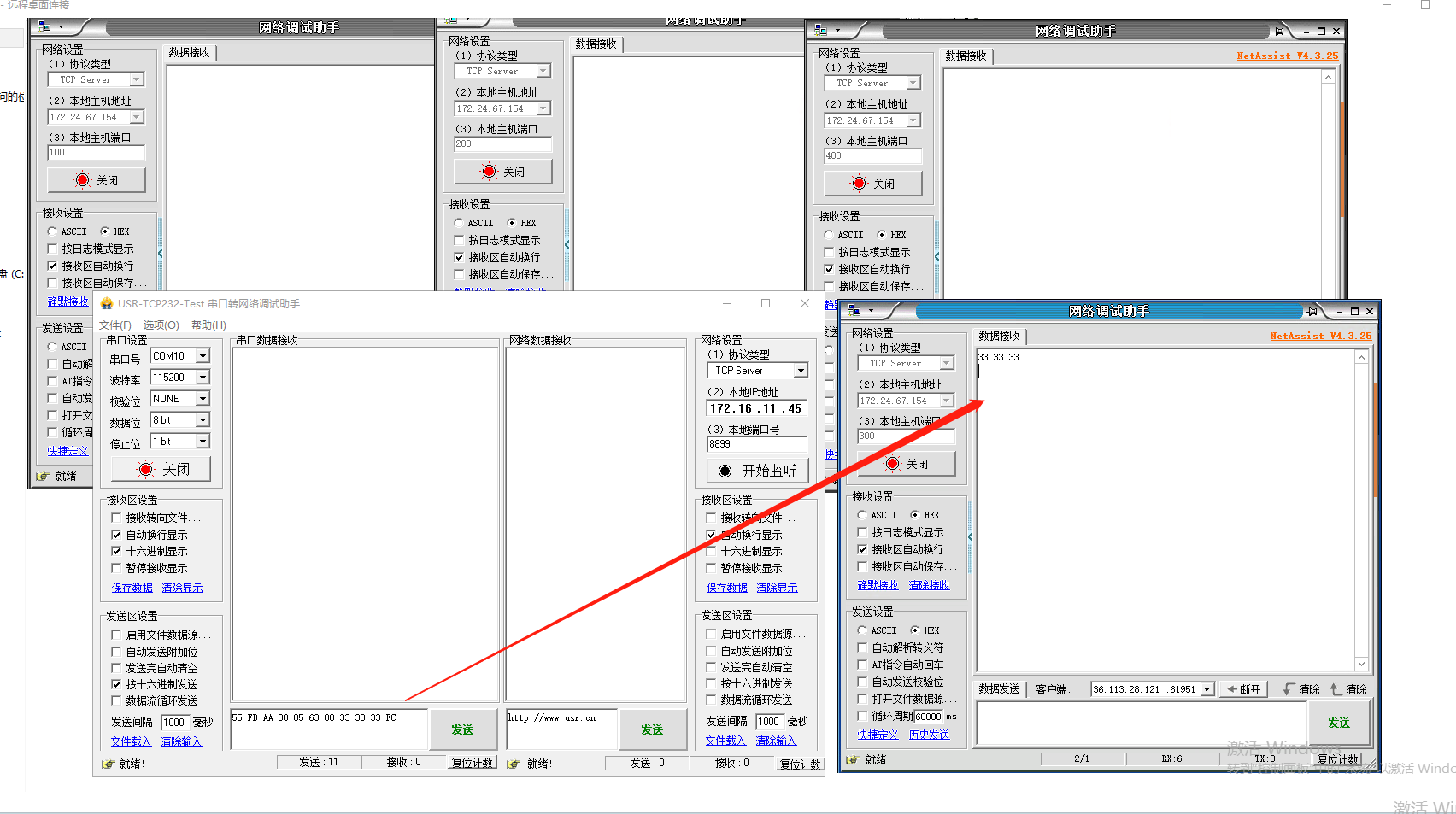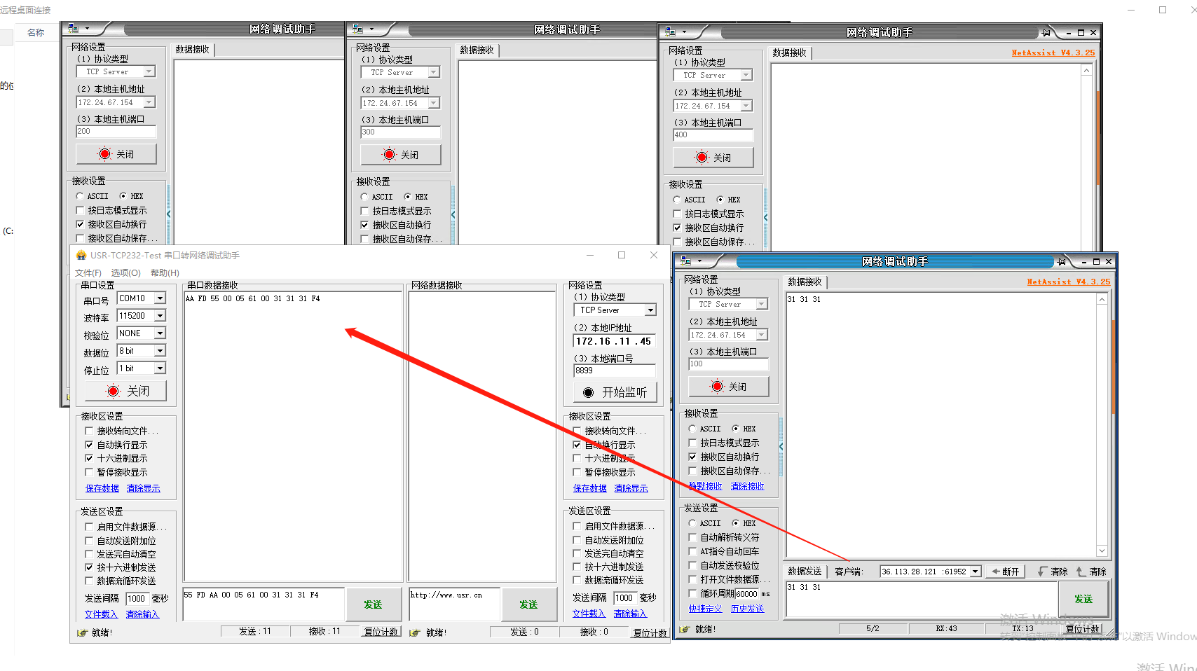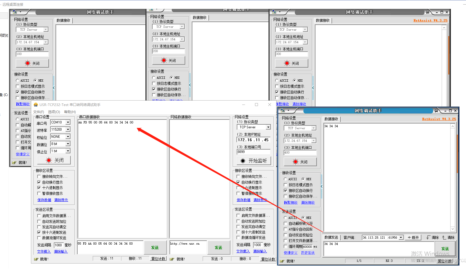 1、登錄遠(yuǎn)程服務(wù)器,打開4個(gè)網(wǎng)絡(luò)助手,分別使用4個(gè)端口100、200、300、400,點(diǎn)擊連接。USR-DR502會(huì)和4個(gè)網(wǎng)絡(luò)助手建立TCP連接。