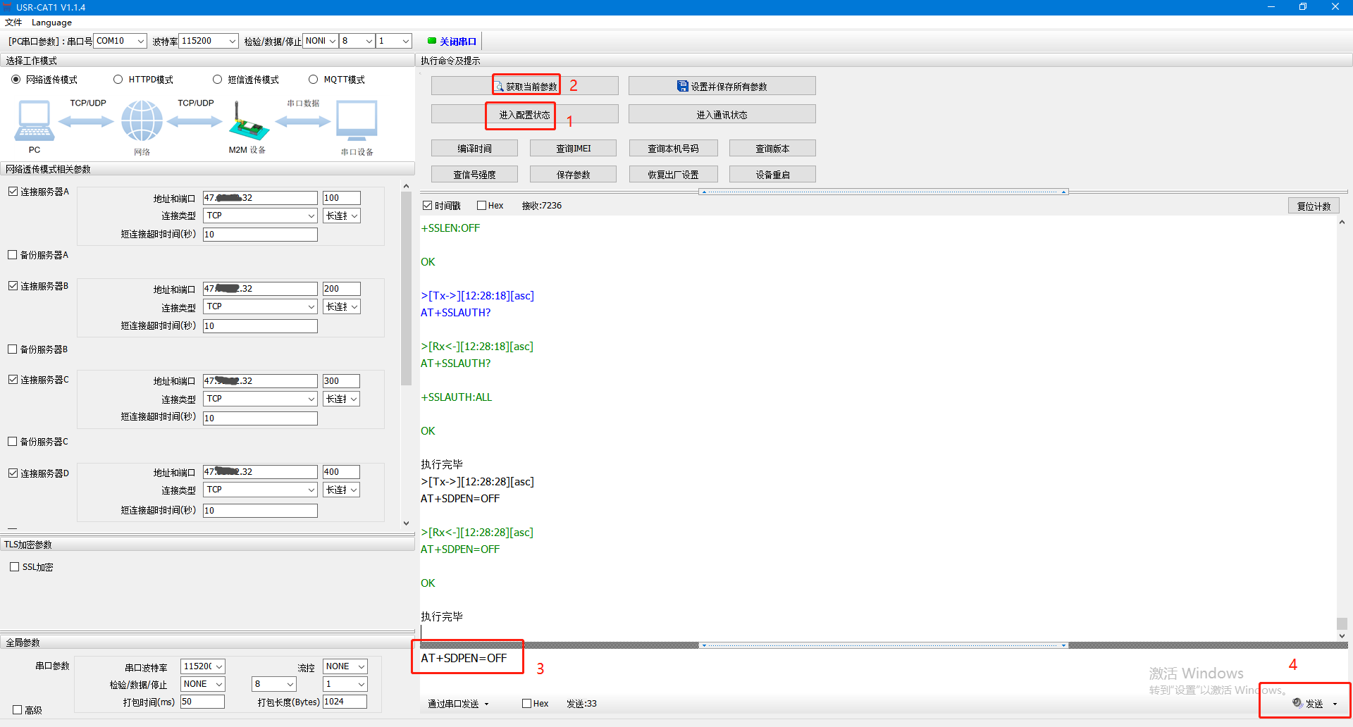 1、設(shè)置軟件串口進(jìn)入配置狀態(tài),用AT指令A(yù)T+SDPEN=OFF關(guān)閉套接字分發(fā)功能。