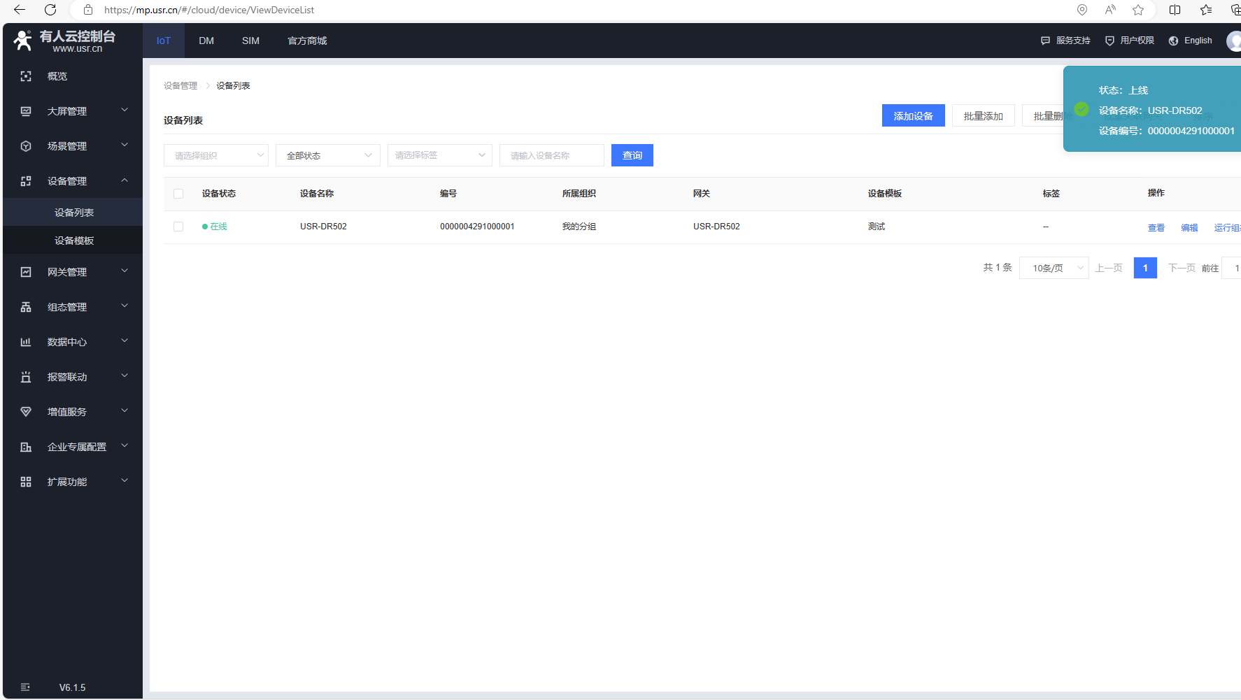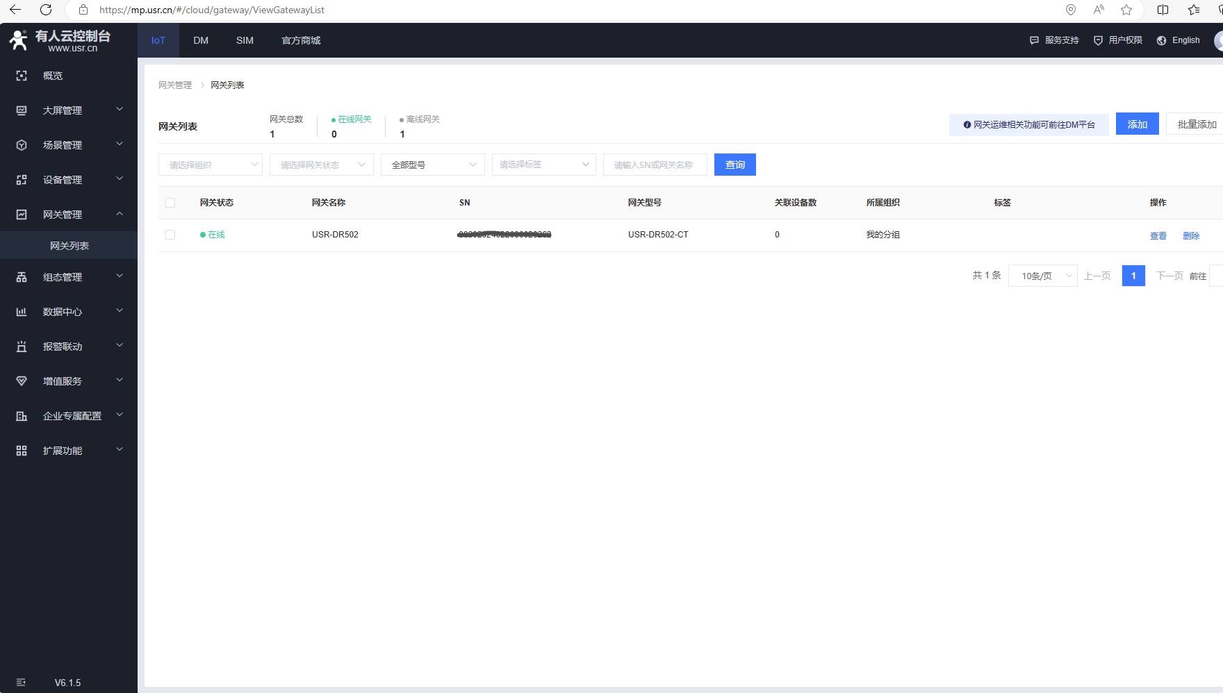 (3)添加完成,返回網(wǎng)關(guān)列表,USR-DR502支持我們內(nèi)置SIM卡,聯(lián)網(wǎng)正常后,網(wǎng)絡狀態(tài)在線。