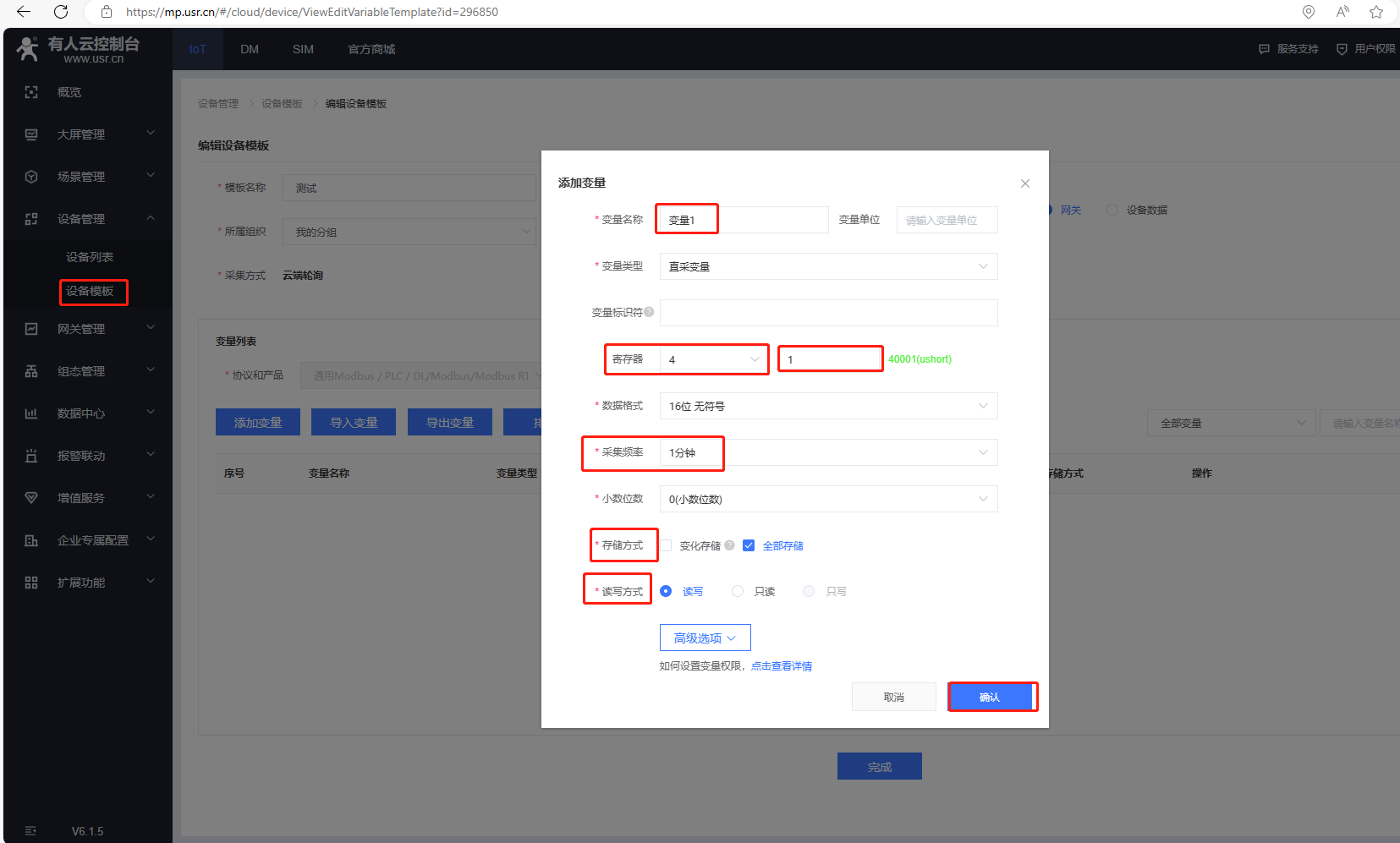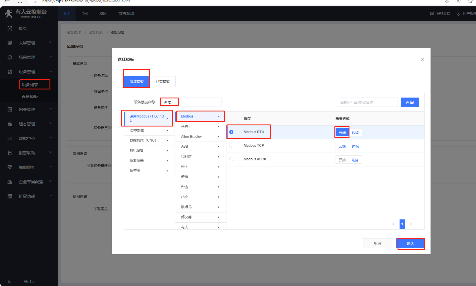選擇新建模板,輸入設備模板名稱,通用Modbus/PLC/DL,選擇Modbus,協(xié)議選擇Modbus Rtu,采集方式云端,最后確認。