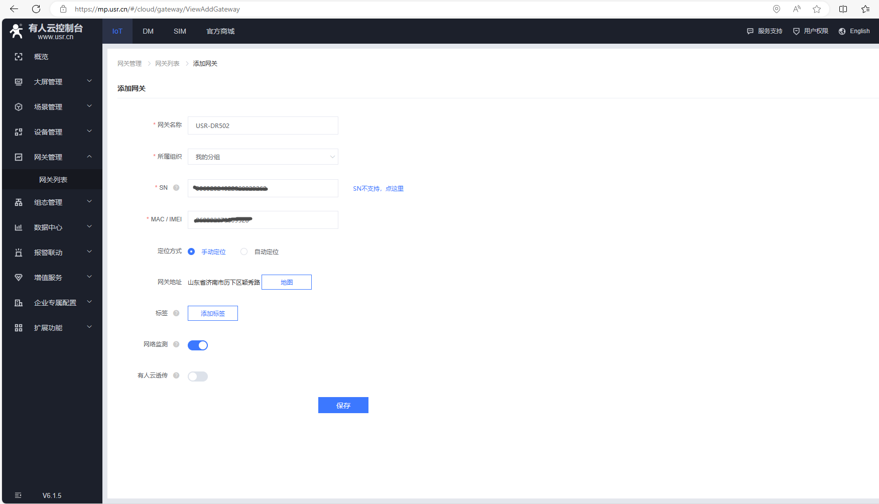 (2)USR-DR502查看產(chǎn)品反面標簽,上面有SN信息,可以微信掃碼,查看SN和IMEI信息,在有人云上添加設備,用云端輪詢時有人云透傳需要關(guān)閉,最后點擊保存。