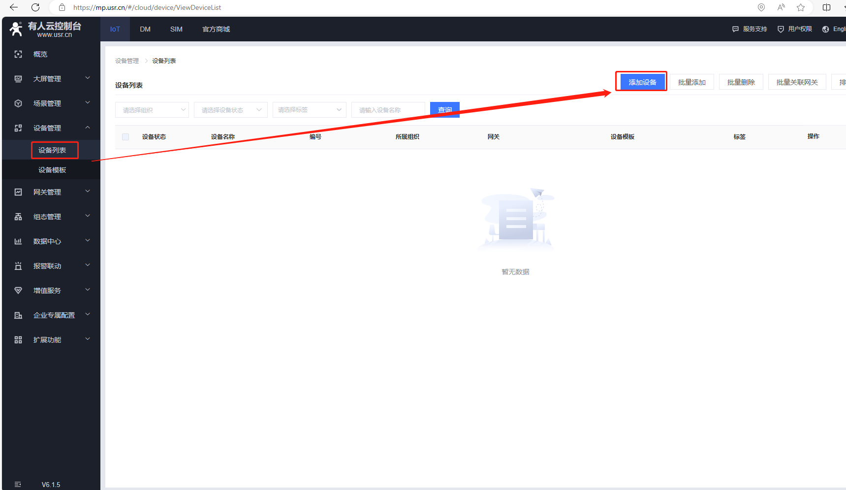 (4)添加設備,點擊設備管理,點擊設備列表,點擊添加設備。
