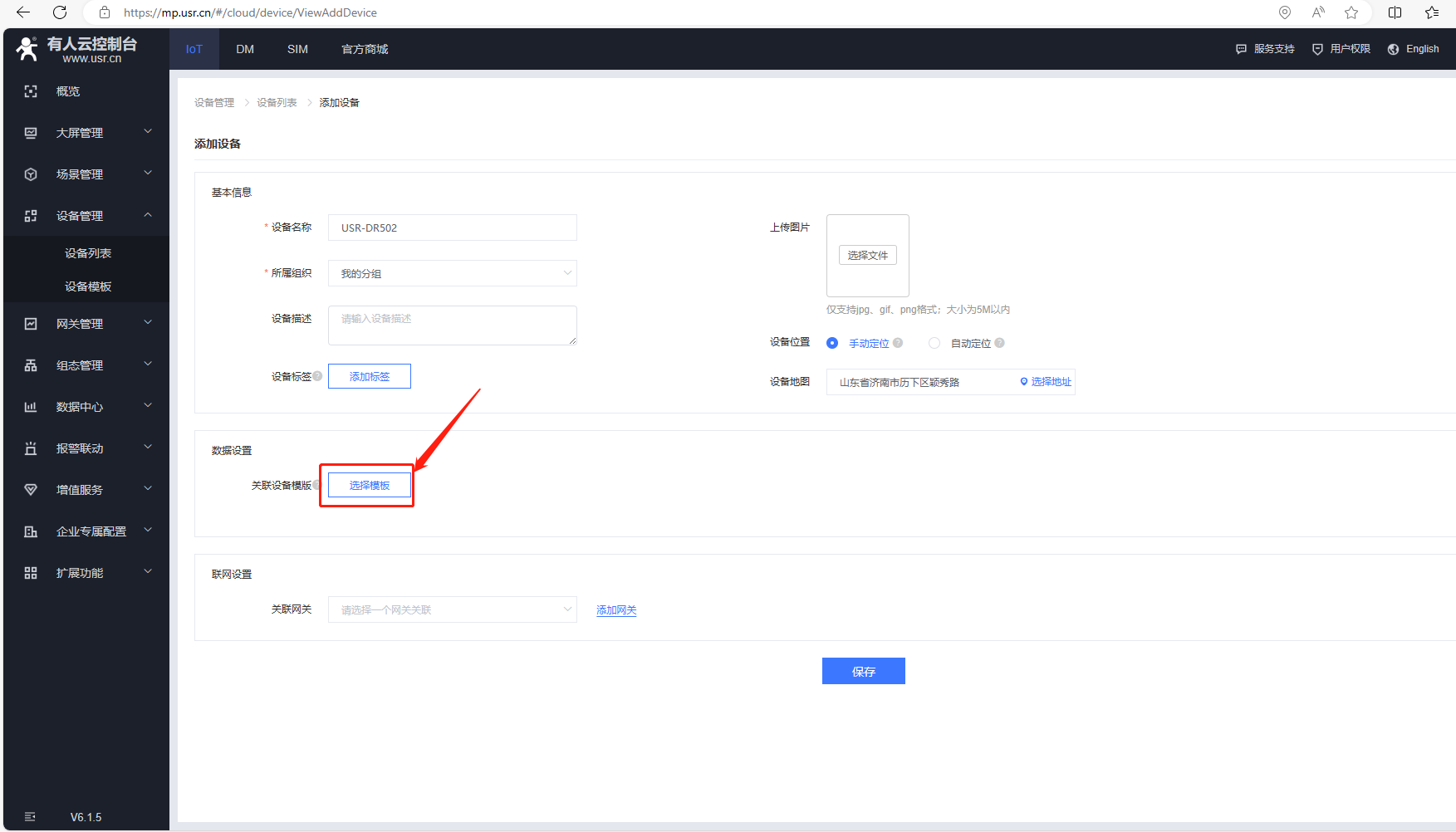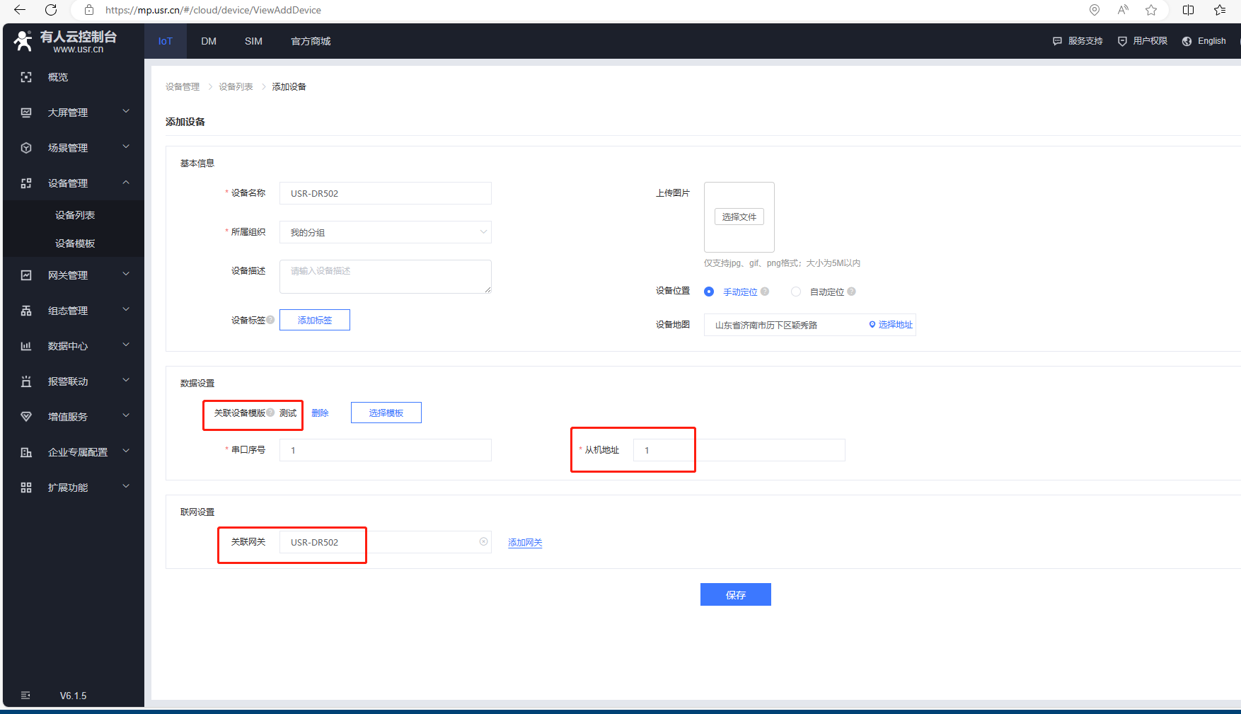 聯(lián)網(wǎng)設置,關(guān)聯(lián)網(wǎng)關(guān)選擇自身設備,USR-DR502,最后點擊保存。