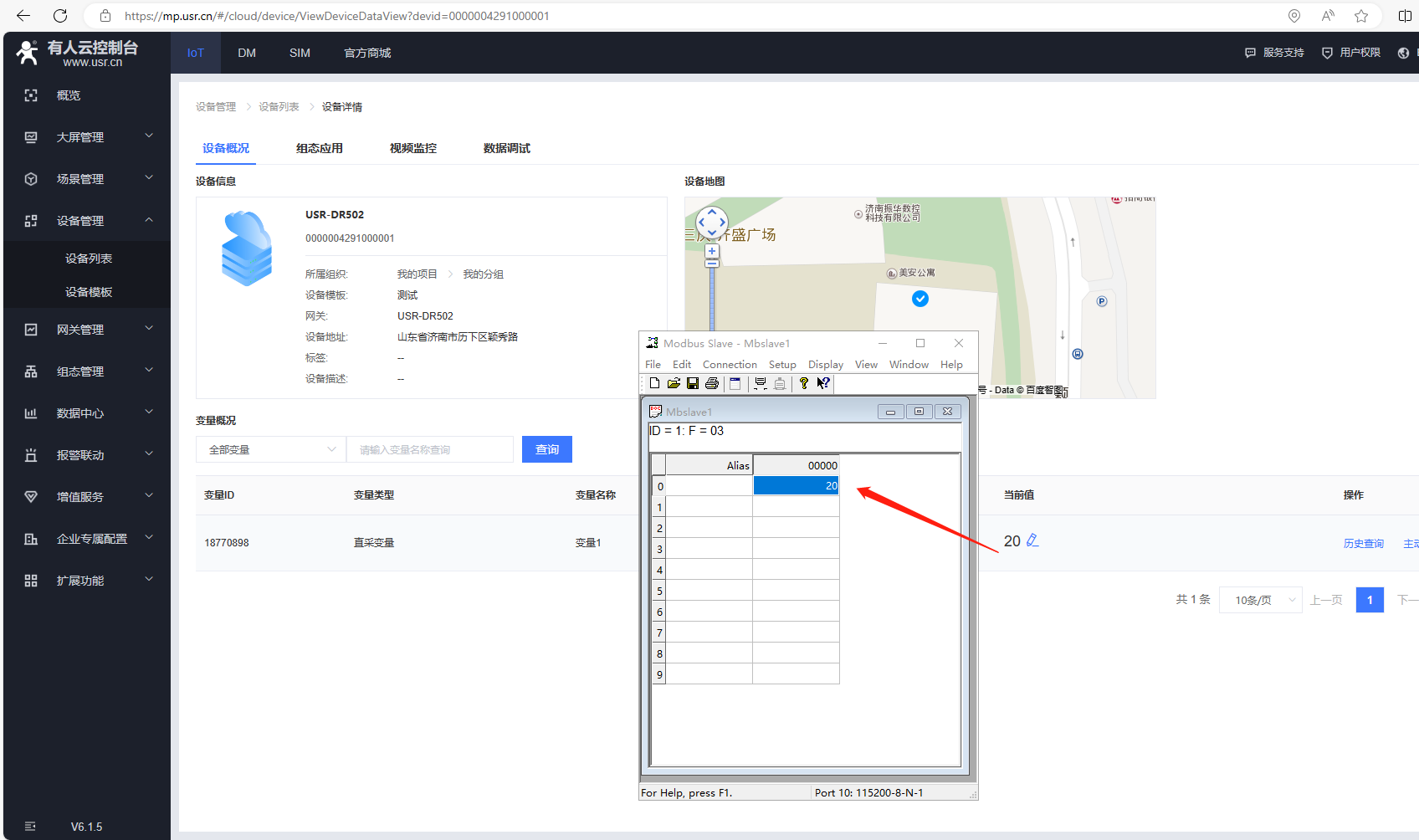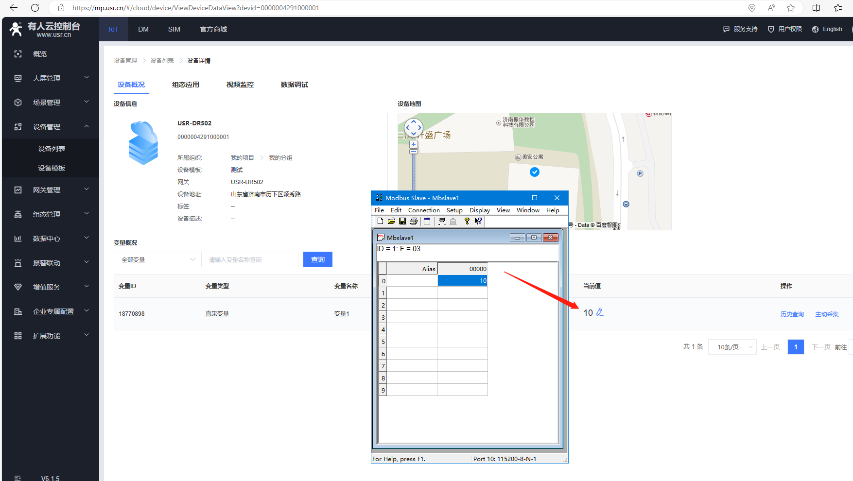 2、MODBUS slave數(shù)據(jù)設置10,有人云設備列表1分鐘采集,可以看到變量采集的當前值數(shù)據(jù)10。