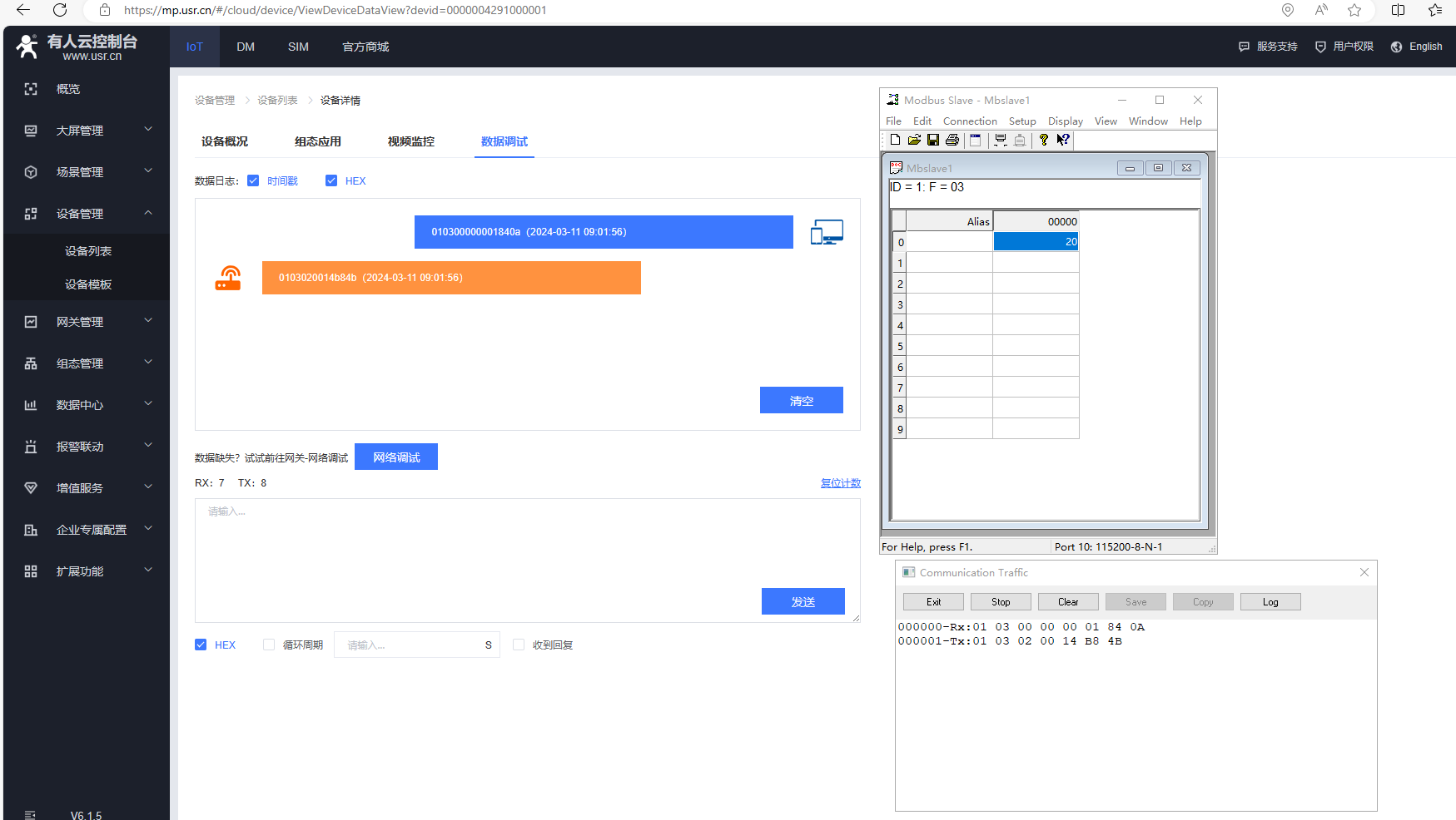 還可以利用有人云的數(shù)據(jù)調(diào)試功能,查看有人云的數(shù)據(jù)收發(fā)是否正常。