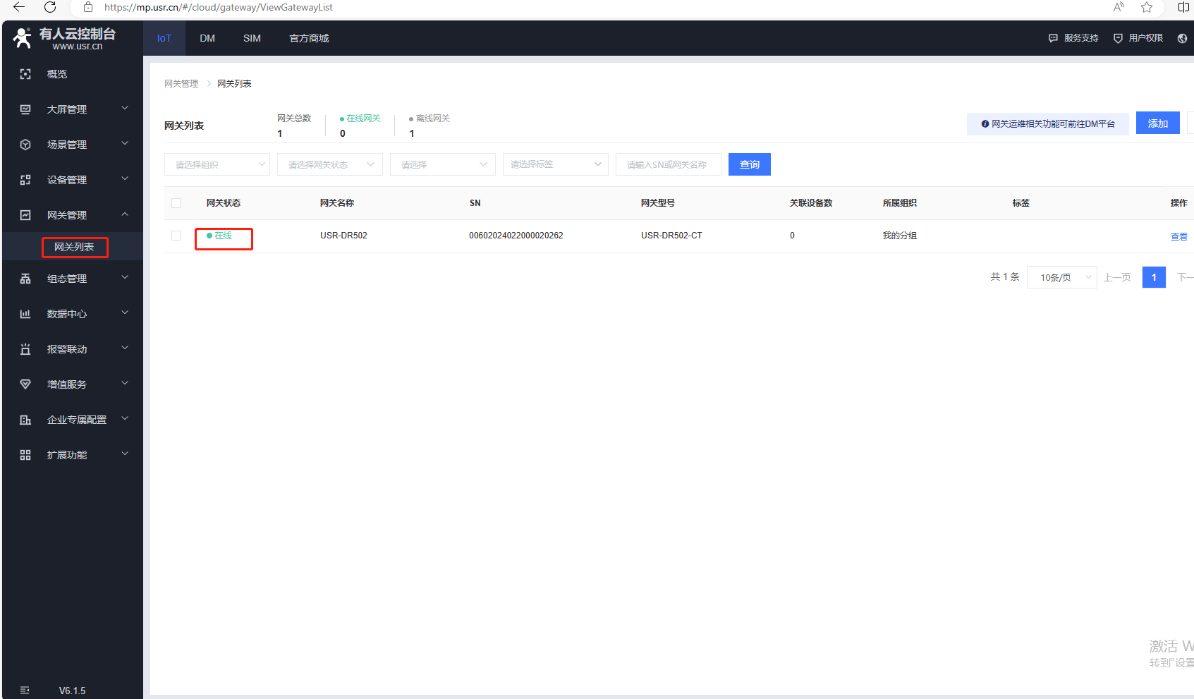 (3)添加完成,返回網(wǎng)關(guān)列表,含有人公司內(nèi)置SIM卡,聯(lián)網(wǎng)正常后,網(wǎng)絡(luò)狀態(tài)在線。