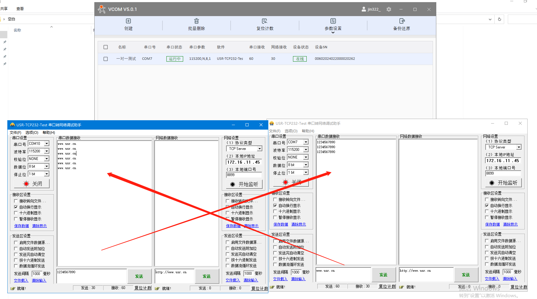 1、打開(kāi)2個(gè)串口助手,分別用USR-DR502實(shí)際USB串口COM10打開(kāi)串口,另一個(gè)串口助手用虛擬串口COM7打開(kāi)串口。