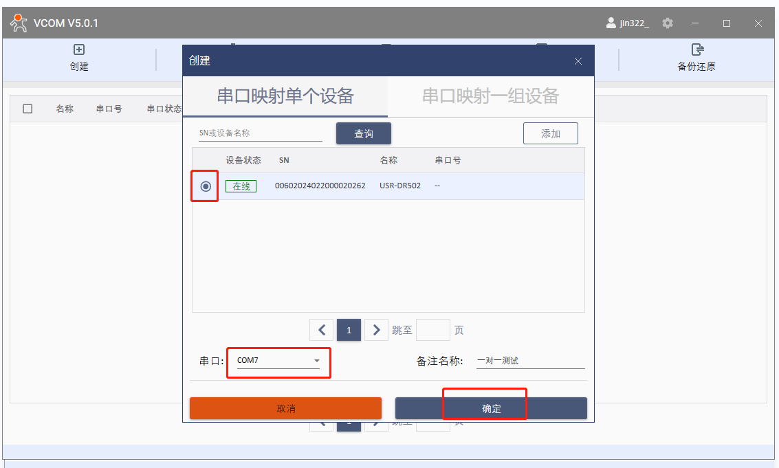 選擇串口映射單個(gè)設(shè)備,勾選在線的USR-DR502,用空閑的COM7作為虛擬串口的COM口號(hào),點(diǎn)擊確定。