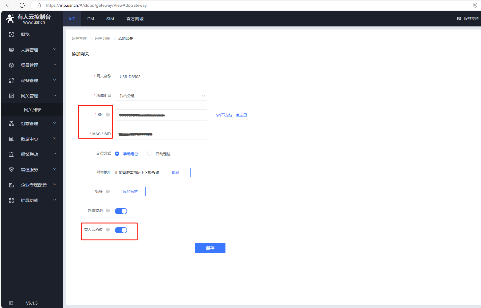 (2)USR-DR502查看產(chǎn)品反面標(biāo)簽,有SN信息,微信掃碼可以查看IMEI和SN信息,使用SN和IMEI在有人云上添加設(shè)備,和虛擬串口一對(duì)一通訊,有人云透?jìng)餍枰催x開(kāi)啟,最后點(diǎn)擊保存。