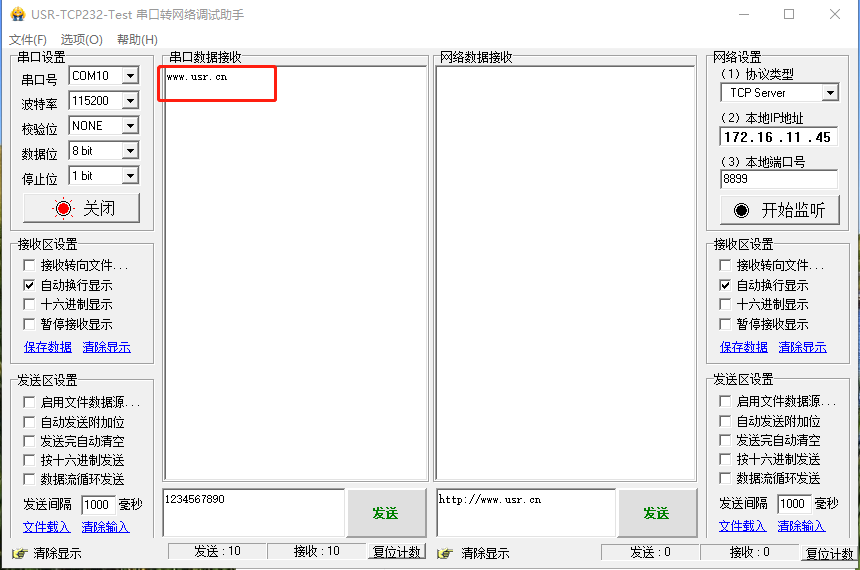 USR-DR502串口接USB-DR502串口線,電腦打開COM口COM10,串口參數(shù)和USR-DR502串口設(shè)置一致,發(fā)送數(shù)據(jù)1234567890,目標(biāo)電話的手機(jī)可以接收到一條短信,顯示接收內(nèi)容是1234567890。