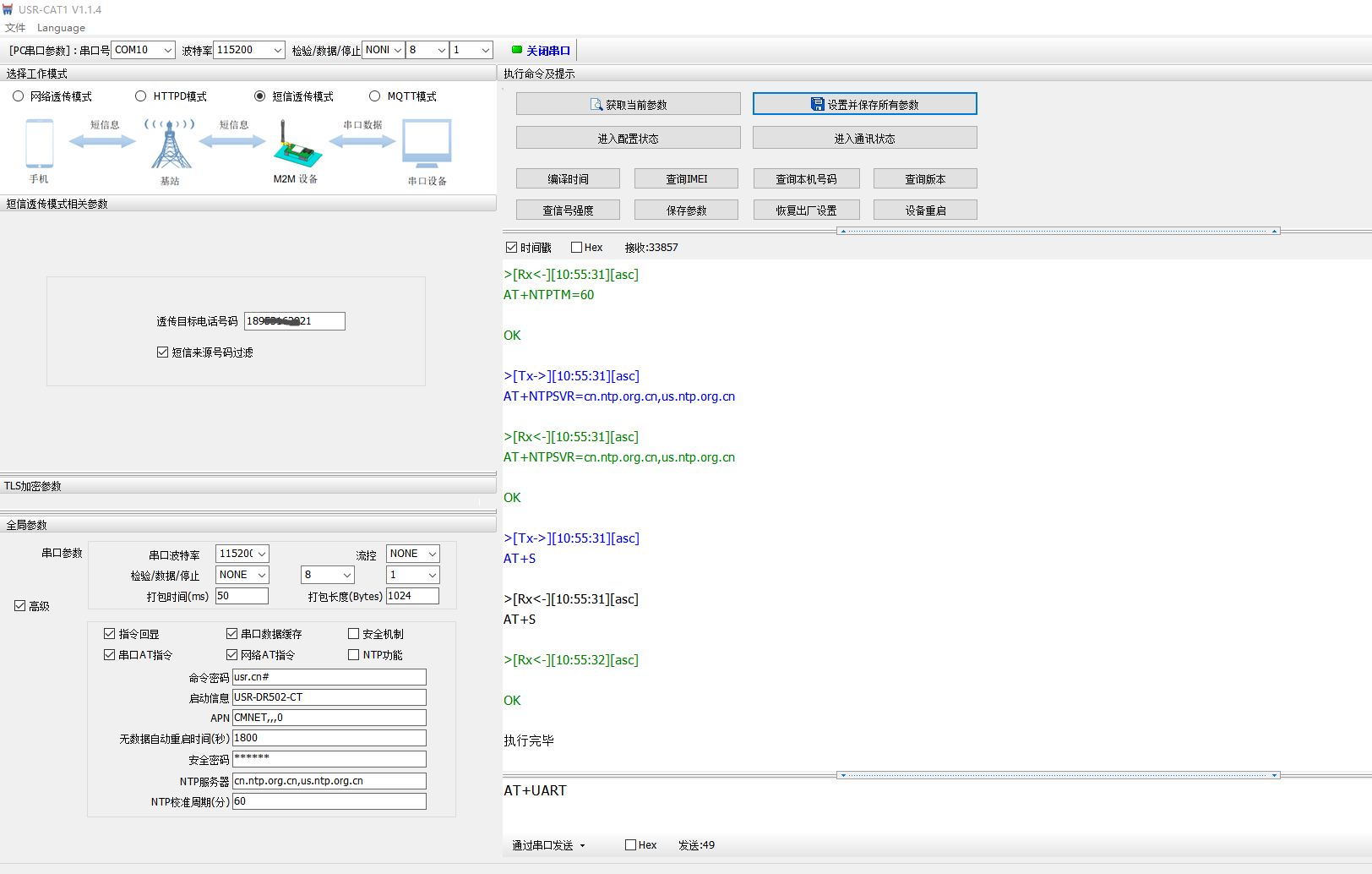 4、選擇短信透傳模式,透傳目標(biāo)電話號碼輸入另一個可以正常接收短信的手機(jī)號碼,點擊設(shè)置并保存所有參數(shù),然后再關(guān)閉串口。