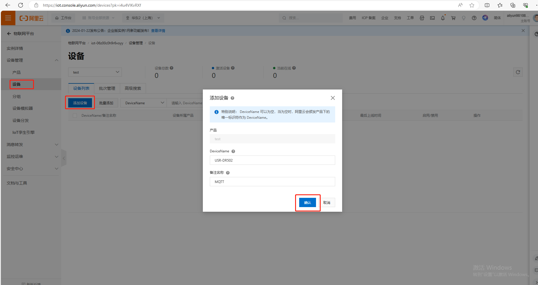 (1)產(chǎn)品創(chuàng)建成功后,添加設(shè)備。點擊設(shè)備,點擊添加設(shè)備,產(chǎn)品名舉例填test,DeviceName填USR-DR502,備注名稱填MQTT,點擊確認。